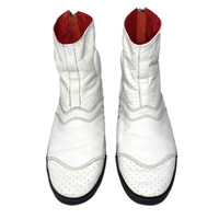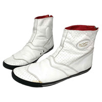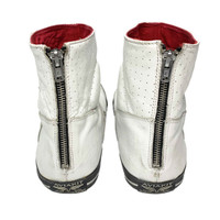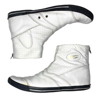 Multi-media research on influential designers. Find our website for more information. --- SS08 Lewis Leathers High-Top Leather Sneakers Comme des Garçons Shirt Lewis Leathers Spring/Summer 2008 Size: 44 Fit: 10-11 US men / 28-29 cm / 43-44 Made in Japan 🇯🇵 Outer length: 12" / 30.5 cm Inner length: 11.25" / 29 cm Width: 4" / 10 cm Height: 6.5" / 16 cm --- High-top leather sneakers from Comme des Garçons Shirt, Spring/Summer 2008, in collaboration with Lewis Leathers. Britain’s classic motorcycle jacket purveyor Lewis Leathers joined forces with the Comme des Garçons Shirt line in this footwear collaboration. Without using the theme too liberally, the footwear does maintain a fine balance between sneaker and jacket inspirations - a nice connection to the famous jackets produced by the two brands. The sneakers are surprisingly comfortable and they fit perfectly with a wide variety of outfits. While there are a few light stains, they are still in amazing condition.
