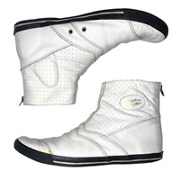 Multi-media research on influential designers. Find our website for more information. --- SS08 Lewis Leathers High-Top Leather Sneakers Comme des Garçons Shirt Lewis Leathers Spring/Summer 2008 Size: 44 Fit: 10-11 US men / 28-29 cm / 43-44 Made in Japan 🇯🇵 Outer length: 12" / 30.5 cm Inner length: 11.25" / 29 cm Width: 4" / 10 cm Height: 6.5" / 16 cm --- High-top leather sneakers from Comme des Garçons Shirt, Spring/Summer 2008, in collaboration with Lewis Leathers. Britain’s classic motorcycle jacket purveyor Lewis Leathers has joined forces with the Comme des Garçons Shirt line in this footwear collaboration. Known for their high-quality materials and legendary aesthetic, we see Lewis Leathers and Comme des Garçons incorporate some relatively innovative use of zippers. Without using the theme too liberally, the footwear does maintain a fine balance between sneaker and jacket inspirations - a nice connection to the famous jackets produced by the two brands. Those sneakers are surprisingly extremely comfortable and nice to wear. They fit perfectly with a wide variety of outfits. While there are a few light stains, they are still in amazing condition.