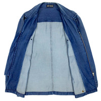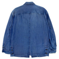 Multi-media research on influential designers. Find our website for more information. --- SS93 Denim Work Suit ISSEY MIYAKE MEN Spring/Summer 1993 100% cellulose fiber (unspecified) Made in Japan π―π΅ Jacket size: M Shoulder width: 20" / 51 cm Chest width: 23.5" / 60 cm Sleeve length: 24.5" / 62 cm Body length: 30.5" / 77 cm Pants size: L Waist: 16" / 41 cm Thigh: 12" / 31 cm Rise: 14.5" / 37 cm Inseam: 30.5" / 77 cm Length: 42" / 107 cm Leg opening: 7" / 18 cm --- Denim work suit from ISSEY MIYAKE MEN, Spring/Summer 1993. This beautiful ensemble comes from one of Issey Miyake's best menswear collections, one heavily marked by sportswear and the Olympics. In this case, the jacket is more closely related to workwear due to its semblance of a chore jacket. The cellulose fabric is lightweight and smooth and has a somewhat iridescent shine to it. The fit is loose and casual yet elegant. The suit is in great condition. Take note that there are some dirt spots, although they are hard to see.
