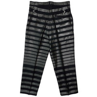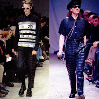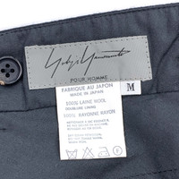 Multi-media research on influential designers. Find our website for more information. --- AW95 Striped Wool Prisoner Pants Yohji Yamamoto Pour Homme Autumn/Winter 1995-1996 Size: M 100% wool Lining: 100% rayon Made in Japan π―π΅ Waist: 16" / 41 cm Thigh: 12.5" / 32 cm Rise: 14" / 36 cm Inseam: 26.5" / 67 cm Length: 38" / 97 cm Leg opening: 8" / 21 cm --- Striped wool prisoner pants from Yohji Yamamoto Pour Homme, Autumn/Winter 1995-1996. This pair of pants is one of the most iconic yet understated pieces from this collection: they were part of some of the most iconic looks on the runway and they were worn by no other than Iggy Pop, as the black shiny stripes are a nod to S&M outfits. They are comfortable and fit nicely. They are in great condition, but take note that the coating has lost some of its shine over time and that sitting for a long time may leave a residue behind.
