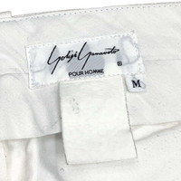 Multi-media research on influential designers. Find our website for more information. --- SS88 Double Waistband Cotton Pants Yohji Yamamoto Pour Homme Spring/Summer 1988 100% cotton Made in Japan 🇯🇵 Waist: 16.5" / 42 cm Thigh: 15.5" / 39 cm Rise: 16.5" / 42 cm Inseam: 31" / 79 cm Length: 42" / 107 cm Leg opening: 9" / 23 cm --- Double waistband cotton pants from Yohji Yamamoto Pour Homme, Spring/Summer 1988. The main thing about those pants is that they have a double waistband, which allows you to wear up to two belts at the same time, at the height you want. I normally tie my belt around the upper waistband and attach my fanny pack around the lower one. Those pants are extremely comfortable, casual, and easy to wear. They fit quite oversized. They are not in great condition because of the multiple stains.