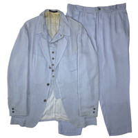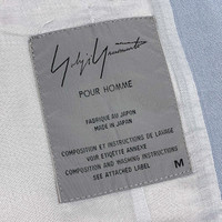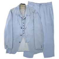 Multi-media research on influential designers. Find our website for more information. --- SS97 Light Rayon Three-Piece Suit Yohji Yamamoto Pour Homme Spring/Summer 1997 100% rayon Lining: 100% rayon Made in Japan π―π΅ - Blazer - Shoulder width: 19" / 48 cm Chest width: 23" / 58 cm Sleeve length: 27" / 68 cm Body length: 33" / 84 cm - Vest - Shoulder width: 16" / 41 cm Chest width: 20.5" / 52 cm Body length: 25" / 64 cm - Pants - Waist: 17" / 43 cm Thigh: 12.5" / 32 cm Rise: 15" / 38 cm Inseam: 27" / 69 cm Length: 38" / 97 cm Leg opening: 7.5" / 19 cm --- Light rayon three-piece suit from Yohji Yamamoto Pour Homme, Spring/Summer 1997. This is an incredibly rare and amazingly iconic piece from the collection. The rayon fabric is exceptionally light, making it perfect for summer. The whole thing fits perfectly on the body with a rather slim fit. The pants are in good condition with only two small spots around the butt. The blazer and the vest are in relatively bad shape, however, with multiple marks and sweat stains, although there is no major flaw. Still, it is in good enough condition to wear for all occasions.