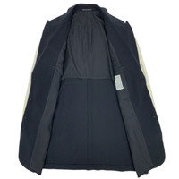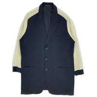 Multi-media research on influential designers. Find our website for more information. --- SS98 Jersey Sleeve Wool Jacket Yohji Yamamoto Pour Homme Spring/Summer 1998 Size: M 100% wool Sleeves: 100% polyester Lining: 100% rayon Made in Japan 🇯🇵 Chest width: 25.5" / 65 cm Sleeve length: 32" / 82 cm Body length: 38" / 97 cm --- Jersey sleeve wool jacket from Yohji Yamamoto Pour Homme, Spring/Summer 1998. This iconic jacket is a true collectible piece. Released almost 4 years before Yohji Yamamoto's first collaboration with Adidas, the jersey sleeves with two stripes are clearly inspired by the sportswear brand's three stripes, which Yamamoto had used without their permission about 10 years earlier. The collection was designed such that one size fits all. It has a few holes, but it is clean and in good condition otherwise.