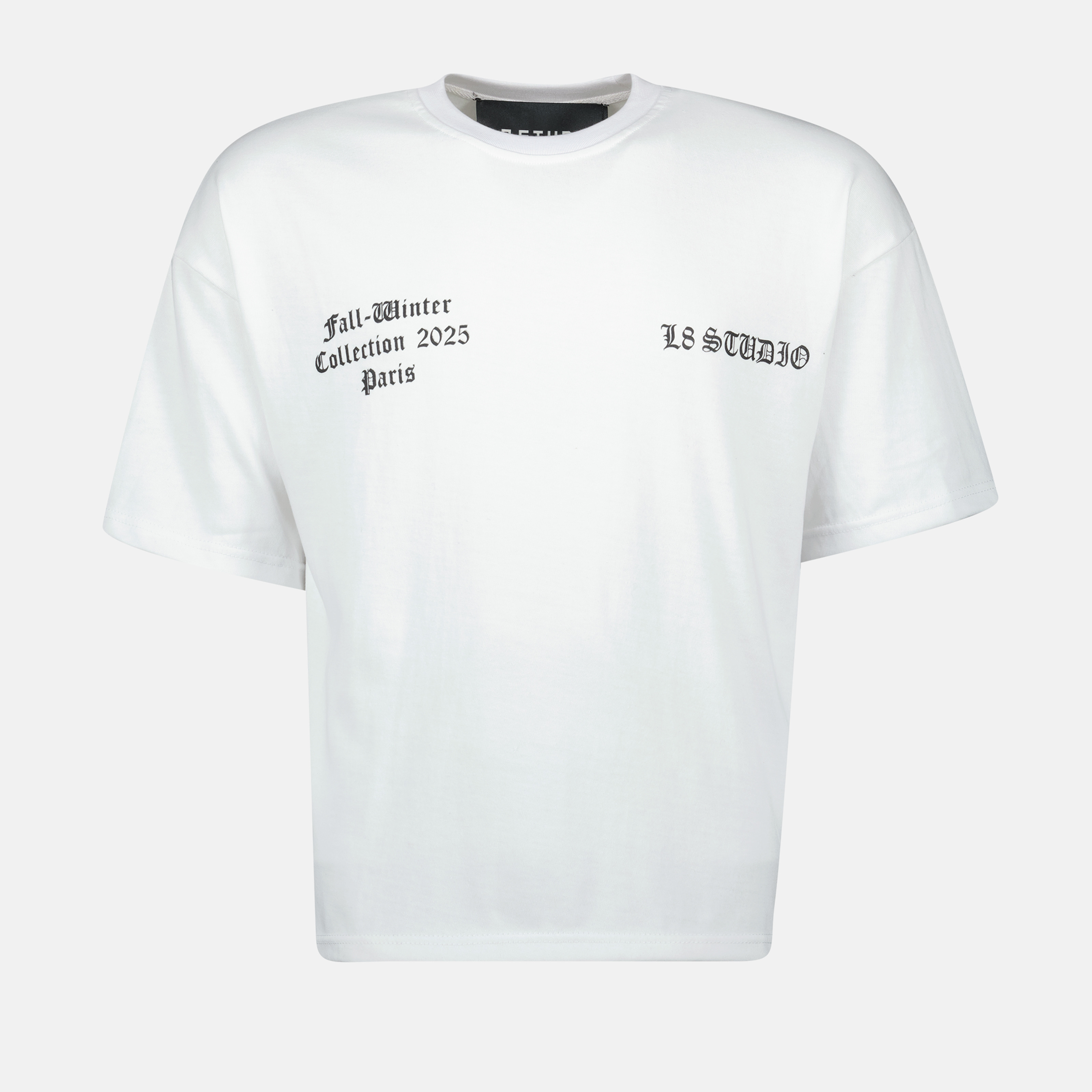 Le T-shirt Passion du Christ blanc de L8 Studio est un modele mixte au col rond et a la coupe oversize. Il fait partie de la collection Printemps-Ete 2025.