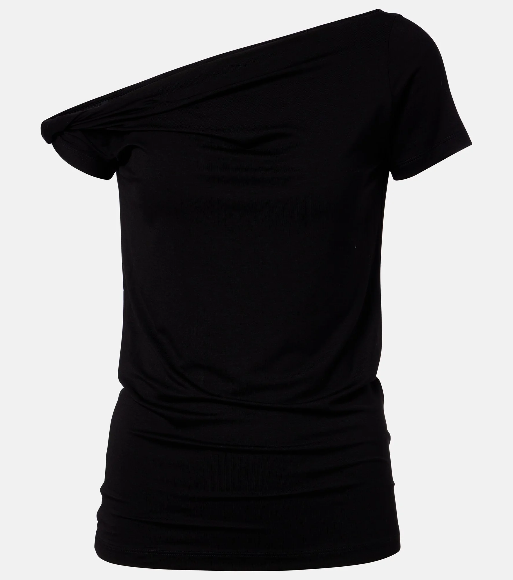 Made from smooth, lightweight, and breathable fabric, this T-shirt from 7 For All Mankind is designed with a sleek one-shoulder silhouette. The close-fitting piece is enhanced with a twisted, draped shoulder detail on one side and a cap sleeve on the other. Product Details - Material: 97% lyocell, 3% elastane - Care instructions: machine wash cold - Made in Portugal - Color: black - Designer color name: Lyocell Black - Item number: P01149541 Size & Fit - True to size - Fitted - Stretchy fabric - Falls to the hip - The model seen in the picture is 178cm-5'10" and wearing a size XS