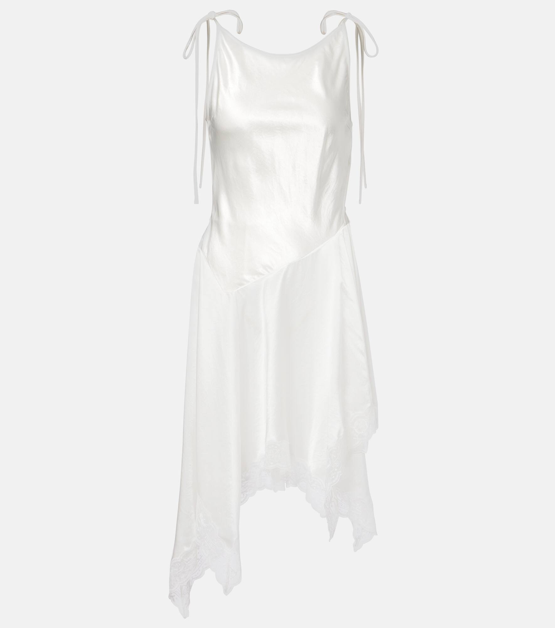 Stockholm-based Acne Studios has a firmly established cult following thanks to its Scandinavian-cool aesthetic. Crafted from satin, this minidress features lace-trimmed detailing along its asymmetric hem. Product Details - Material: 100% acetate - Care instructions: dry clean - Made in China - Designer color name: White - Item color: white - Details: 100% nylon - Self-tie shoulder straps - Closure: self-ties - Item number: P01088668 Size & Fit - True to size - Cinched waist - Non-stretchy fabric - The model seen in the picture is 178cm-5'10" and wearing a size DE 34