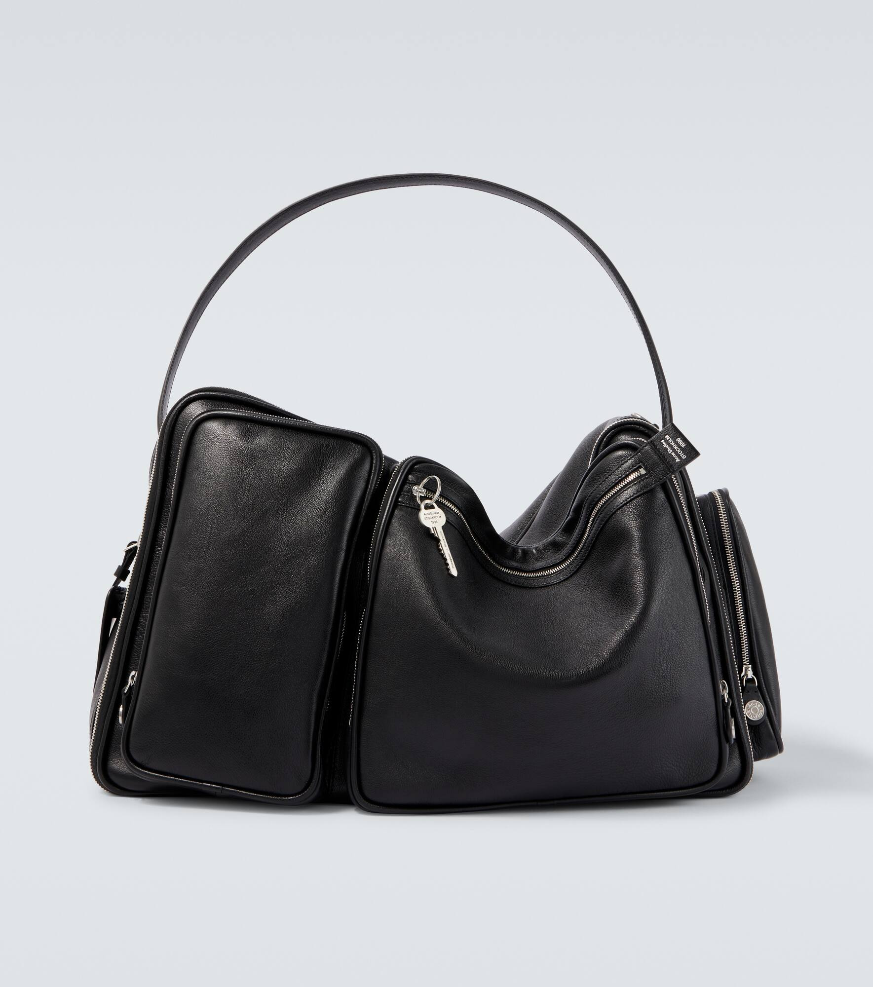 Everyday looks get an edge with the Camero Hotel shoulder bag from Acne Studios. Crafted from leather, this structured design features multiple zip compartments, a branded key charm, a top handle, and an adjustable crossbody strap for versatile wear. Product Details - Material: calf leather - Lining: fabric - Made in Italy - Designer color name: Black - Item color: black - Hardware color: silver - Top handle, Detachable shoulder strap - Internal details: internal slot pockets, single compartment - Closure: two-way zipped top - Zipped front and back pockets - Zipped side pocket - Detachable charm - Protective feet - Item number: P01066562 Size & Fit - Height 35cm-14" - Width 57cm-22.5" - Depth 16cm-6.5" - Length of handles 76cm-30" - Adjustable shoulder strap - Max. length shoulder strap 123cm-48.5"