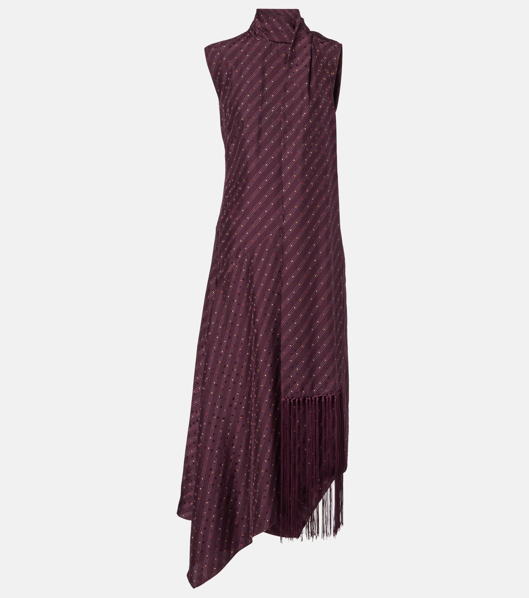 The asymmetric Dale maxi dress from Acne Studios is crafted from lightweight silk. The sleeveless design features a high neckline, a draped scarf with fringed edges that cascades along the skirt, and an all-over subtle polka-dot pattern. Product Details - Material: 100% silk - Care instructions: dry clean - Made in Portugal - Designer color name: Burgundy - Item color: burgundy - Trim: 100% polyester - Closure: invisible zipper - Item number: P01076427 Size & Fit - True to size - Cinched waist - Non-stretchy fabric - The model seen in the picture is 178cm-5'10" and wearing a size DE 34