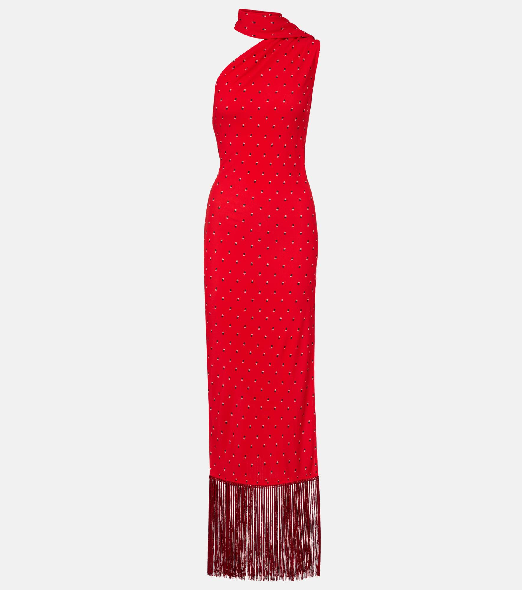 The Dassy printed maxi dress from Acne Studios exudes understated elegance with its draped, asymmetric silhouette. Sleeveless in design, this style is finished with a scarf-inspired collar and a sophisticated fringed hem. Product Details - Material: 100% viscose - Care instructions: dry clean - Made in Portugal - Designer color name: Red - Item color: red - Material II: 98% acetate, 2% polyester - Fringed hem - Item number: P01076442 Size & Fit - True to size - Low back - Fitted - Slightly stretchy fabric - The model seen in the picture is 178cm-5'10" and wearing a size DE 34