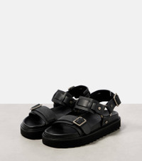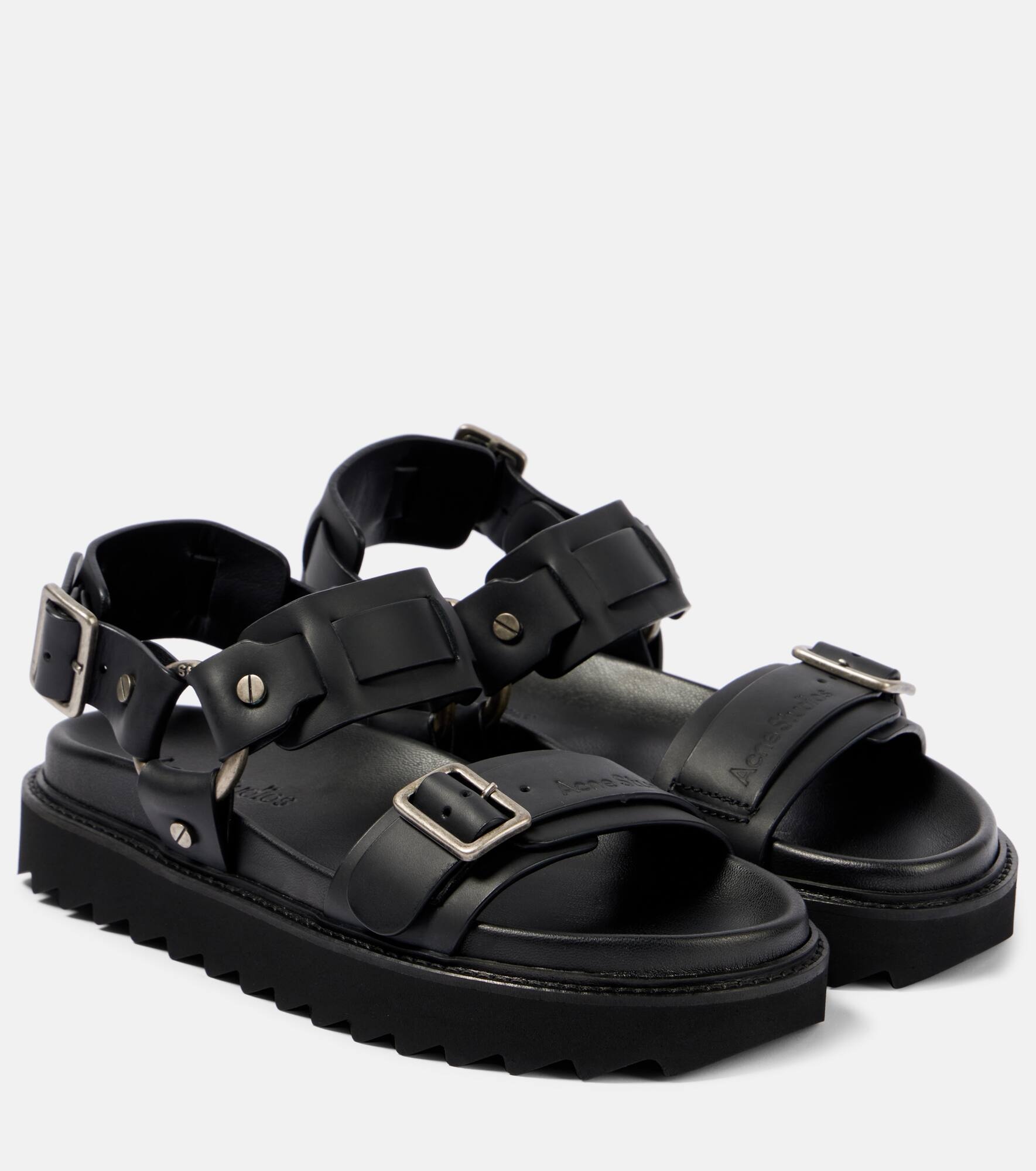 Inspired by Acne Studios' Scandinavian-cool aesthetic, these leather sandals feature a platform sole, stud detailing, and silver-tone hardware. The debossed logo adds a signature touch, making them a modern yet effortless wardrobe staple. Product Details - Upper: leather - Lining: leather - Sole: leather insole and sole - Toe shape: almond open toe - Made in Portugal - Includes: shoe box, dust bags - Designer color name: Black - Closure: buckle fastening - Hardware color: antique silver - Item number: P00899006 Size & Fit - Fits small to size - we recommend trying one size larger - European sizes - 3,5cm-1.5" platform (size EU 38) - 4cm-1.5" wedge heel (size EU 38)