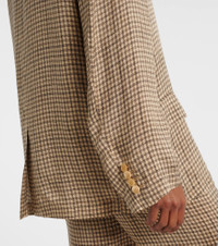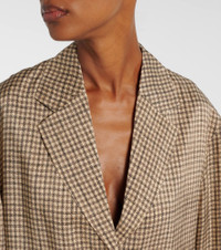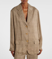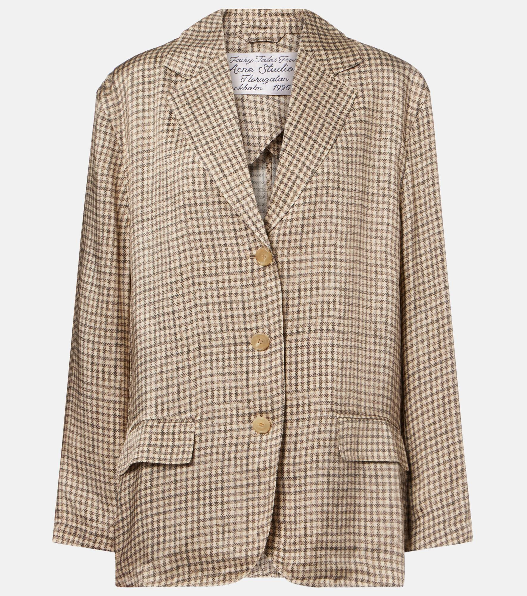 The Junida blazer by Acne Studios finishes every look with effortless sophistication. Designed with a three-button fastening, this piece is tailored to a structured silhouette with padded shoulders and showcases a classic checked motif. Product Details - Material: 100% cupro - Care instructions: dry clean - Made in China - Designer color name: Beige - Item color: beige - Closure: buttoned front - Notched lapel - Pockets: flap pockets - Cuff: buttoned - Vent: single - Item number: P01088665 Size & Fit - Fits large to size - we recommend trying one size smaller - Dropped shoulders - Designed for a loose fit - Non-stretchy fabric - Falls below the hip - slit length 19cm-7.5" - The model seen in the picture is 178cm-5'10" and wearing a size DE 32