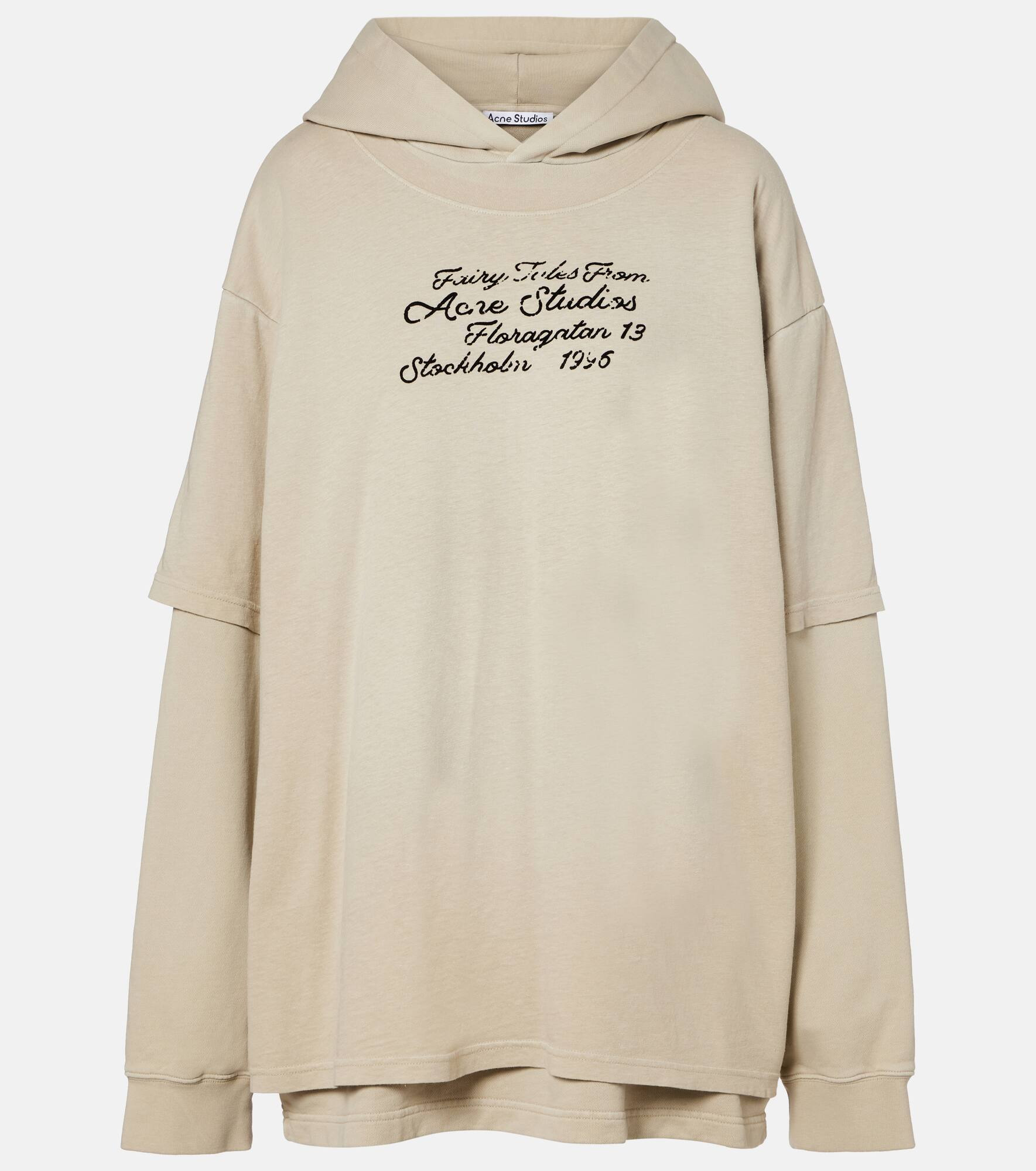 This long-sleeve sweatshirt from Acne Studios is crafted from pure cotton and cut to a relaxed fit. The design features layered sleeves, a hood, and the brand's logo fairytale print for a playful yet elevated look. Product Details - Material: 100% cotton - Care instructions: machine wash at 30 degrees - Made in Portugal - Designer color name: Faded Beige - Item color: beige - Hood - Cuff: ribbed - Item number: P01088848 Size & Fit - True to size - Dropped shoulders - Oversized - Slightly stretchy fabric - Falls below the hip - The model seen in the picture is 178cm-5'10" and wearing a size XS