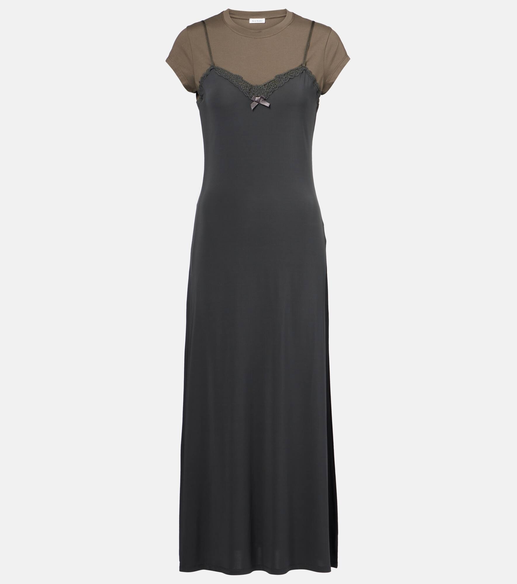 This midi dress from Acne Studios is made to look like a slip dress layered over a fitted T-shirt. The piece is constructed from fluid jersey and features subtle lace trims at the bust. Product Details - Material: 93% viscose, 7% elastane - Care instructions: dry clean - Made in Portugal - Designer color name: Grey/Anthracite - Item color: gray - Material II: 90% cotton, 10% elastane - Adjustable shoulder straps - Item number: P01024744 Size & Fit - True to size - Cinched waist - Slightly stretchy fabric - The model seen in the picture is 178cm-5'10" and wearing a size XS