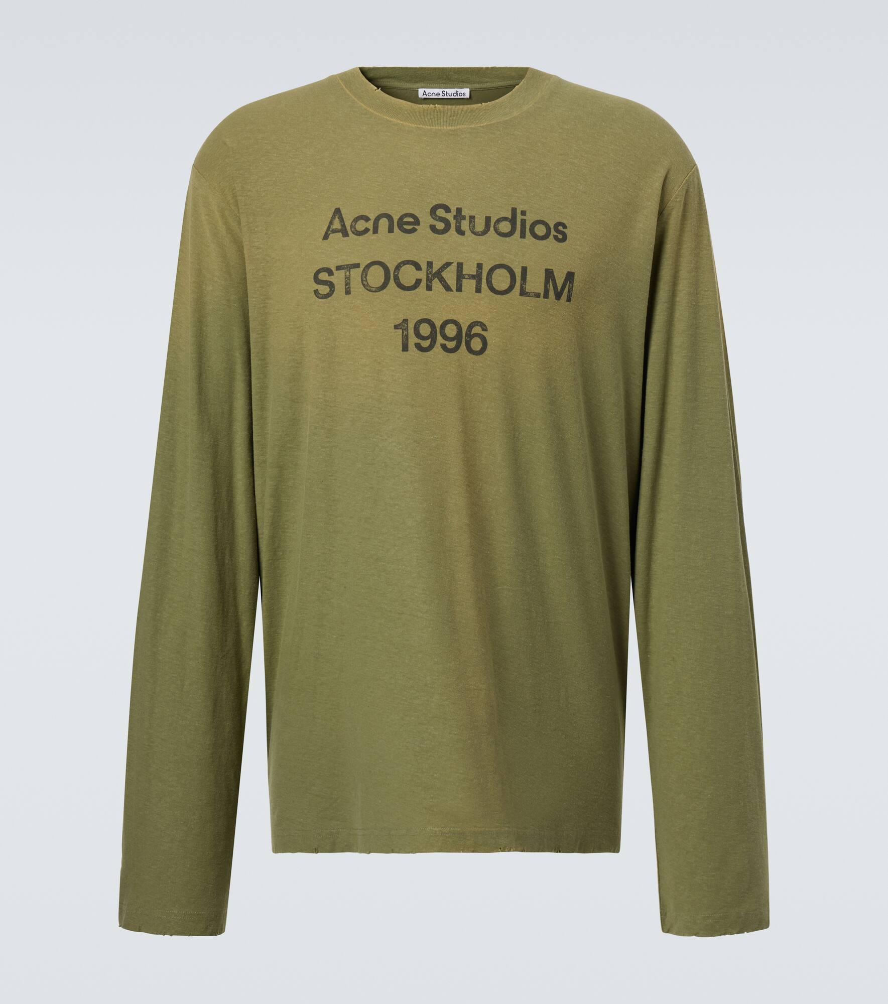 Stockholm-based Acne Studios has a firmly established cult following thanks to its Scandinavian-cool aesthetic. This long-sleeved T-shirt is made from cotton and hemp jersey and features printed logo detailing. Product Details - Material: 85% cotton, 15% hemp - Care instructions: machine wash at 30 degrees - Made in Portugal - Designer color name: Olive Green - Item color: green - Collar: crewneck - Item number: P01066535 Size & Fit - True to size - Dropped shoulders - Designed for a loose fit - Falls below the hip - Height of model is 188cm-74" and wears a size L
