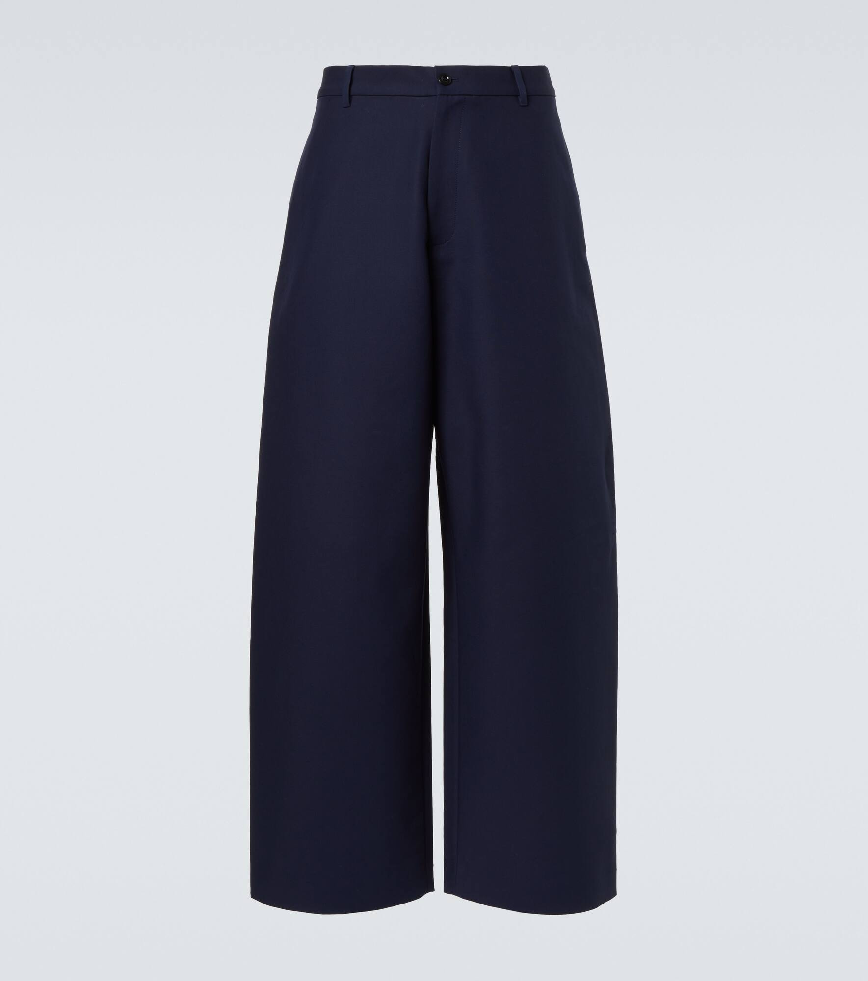 Stockholm-based Acne Studios has a firmly established cult following thanks to its Scandinavian-cool aesthetic. Made from cotton satin, these relaxed, wide-leg, mid-rise cut pants feature branded military buttons and a leather logo patch at the back. Product Details - Material: 100% cotton - Care instructions: machine wash at 30 degrees - Made in Romania - Designer color name: Navy Blue - Item color: blue - Closure: zipper fly, button fastening - Pockets: side slit pockets, back pocket - Belt loops - Item number: P01066526 Size & Fit - True to size - Non-stretchy fabric - Wide-leg - The model in the picture is 185cm-6'1" and wearing a size 50