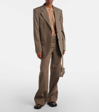 Stockholm-based Acne Studios has earned a firmly established cult following through its cool Scandinavian aesthetic. The Pekko wool-blend pants are tailored to a wide-leg silhouette with a mid-rise waist. Product Details - Material: 65% wool, 35% nylon - Care instructions: dry clean - Made in Portugal - Color: beige - Designer color name: Khaki Beige - Lining: 100% viscose - Closure: zip, hook, and button fastening - Item number: P01145337 Size & Fit - True to size - Non-stretchy fabric - Wide-leg - The model seen in the picture is 178cm-5'10" and wearing a size DE 34