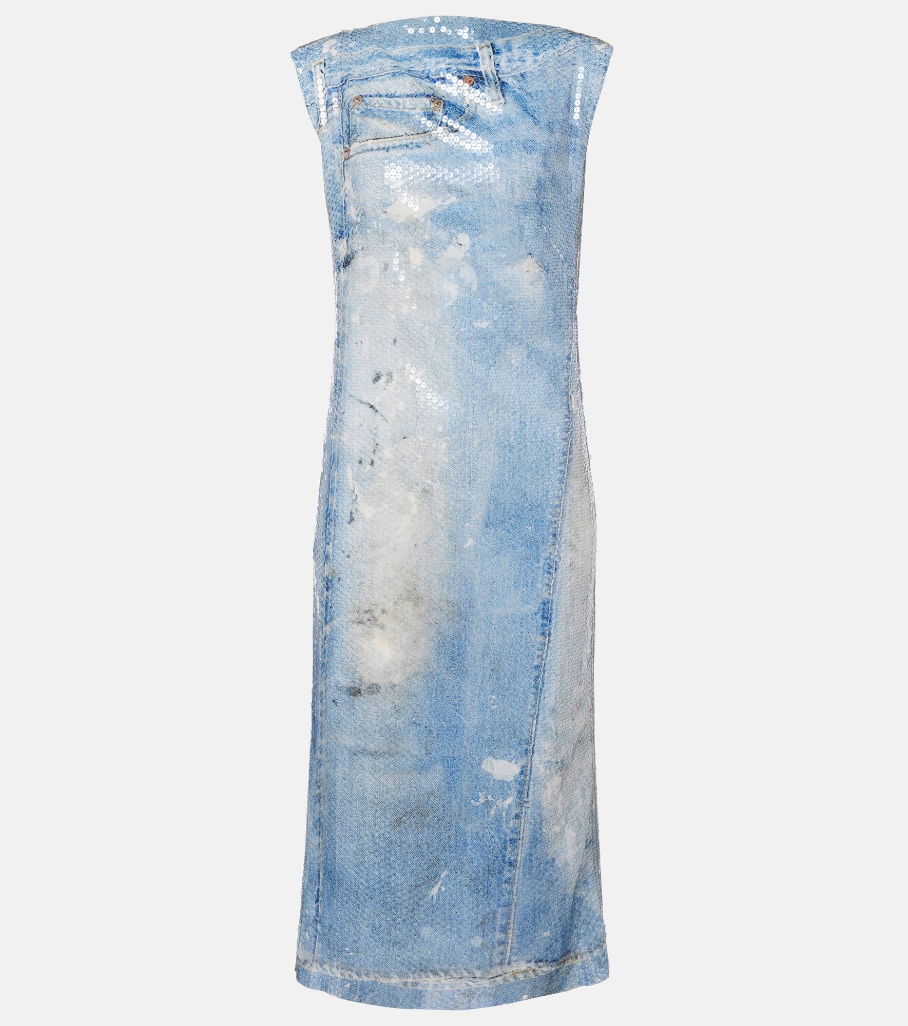 A fun iteration of Acne Studios' signature jeans, this midi dress features a seasonal denim-inspired trompe l'oeil print. Cut to knee-length with a side slit, it is crafted from sequined georgette, for a shiny finish effect. Product Details - Material: 95% polyester, 5% nylon - Care instructions: dry clean - Made in Italy - Designer color name: Blue - Item number: P01007149 Size & Fit - True to size - Straight fit - Non-stretchy fabric - slit length 47cm-18.5" - The model seen in the picture is 178cm-5'10" and wearing a size DT 34