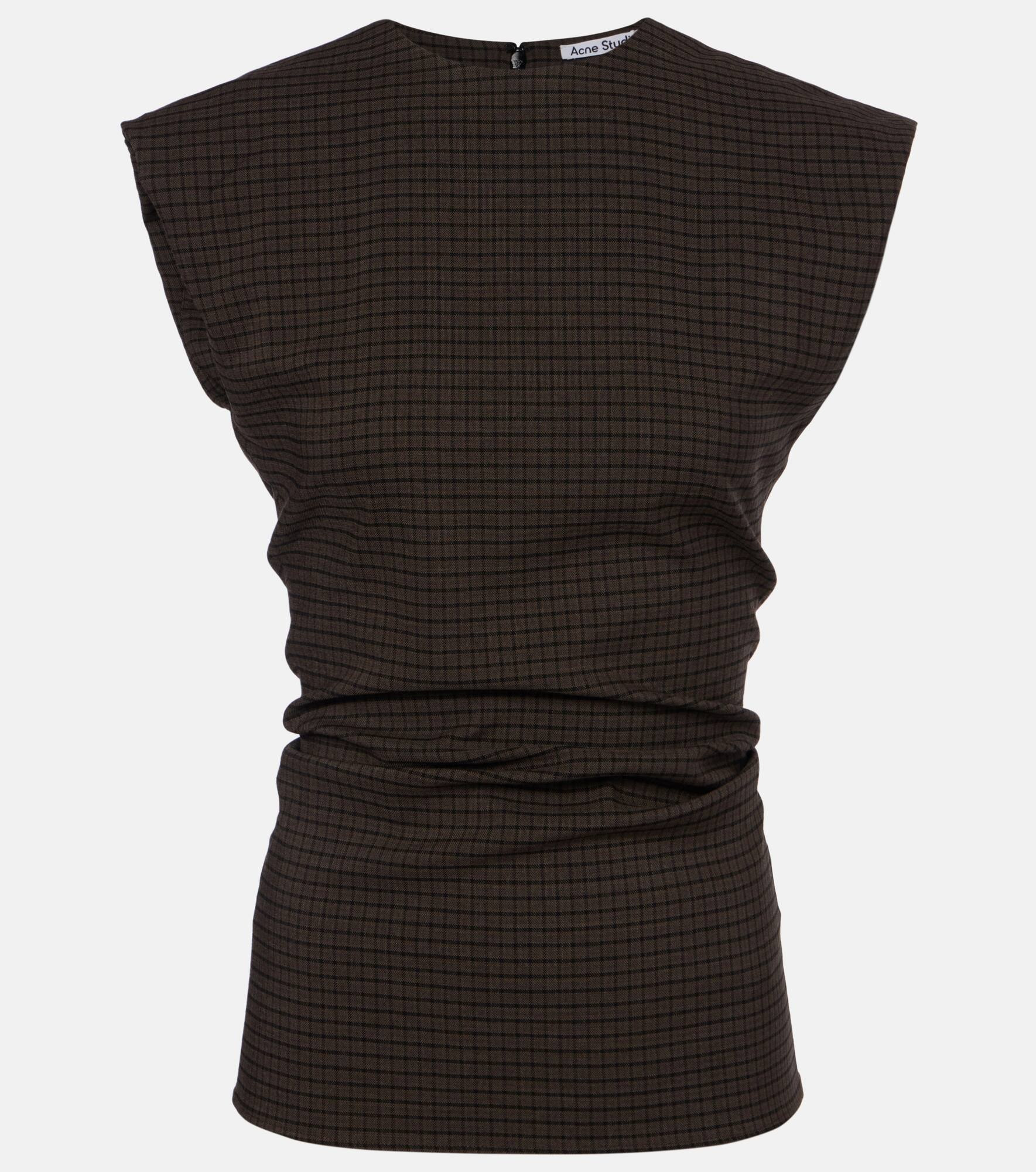 Stockholm-based Acne Studios has earned a firmly established cult following through its cool Scandinavian aesthetic. Crafted in Italy from a wool blend, the Tanado brown-hued top features a sleeveless silhouette and a checked motif. Product Details - Material: 97% wool, 3% elastane - Care instructions: dry clean - Made in Portugal - Designer color name: Multi Brown - Item color: brown - Closure: invisible zipper - Item number: P01088932 Size & Fit - True to size - Cinched waist - Non-stretchy fabric - Falls to the hip - The model seen in the picture is 178cm-5'10" and wearing a size DE 34