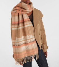 Stockholm-based Acne Studios has a firmly established cult following thanks to its Scandinavian-cool aesthetic. Showcasing the brand name in bold jacquard print, this plaid iteration of the Venus 1996 scarf is made from wool and finished with fringed edges. Product Details - Material: 98% wool, 2% nylon - Care instructions: dry clean - Made in Italy - Designer color name: Beige/Peach - Item color: beige, pink - Item number: P01046987 Size & Fit - Length 200cm-78.5" - Width 40cm-15.5" - Length of fringe 8cm-3"
