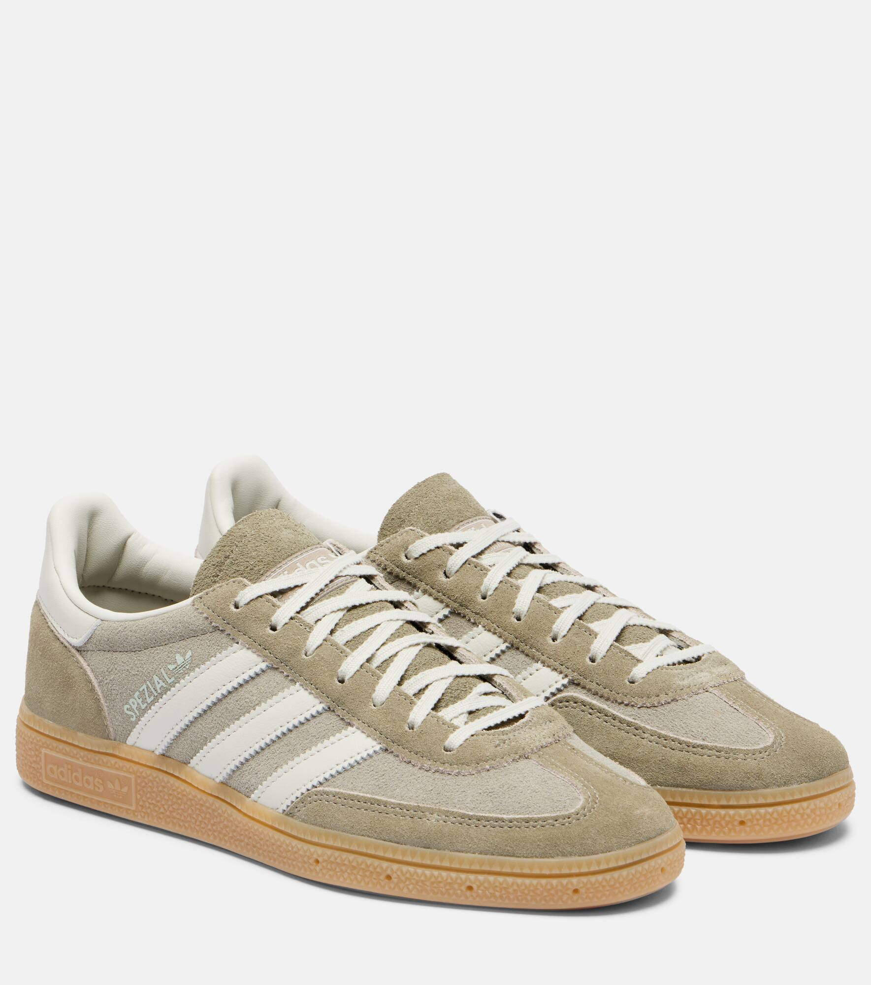 Originally crafted for indoor sports, the Handball Spezial sneakers by Adidas have evolved into a timeless classic with vintage appeal. This pair features suede uppers and showcases the unmistakable three-striped logo. Product Details - Upper: leather - Lining: fabric - Sole: rubber insole and sole - Toe shape: round toe - Made in Vietnam - Includes: shoe box - Designer color name: Silver Pebble/Orbit Grey/Gum 4 - Item color: gray, white - Closure: lace-up - Item number: P01085595 Size & Fit - True to size - UK sizes - 2cm-1" platform (size EU 38) - 3,5cm-1.5" wedge heel (size EU 38)