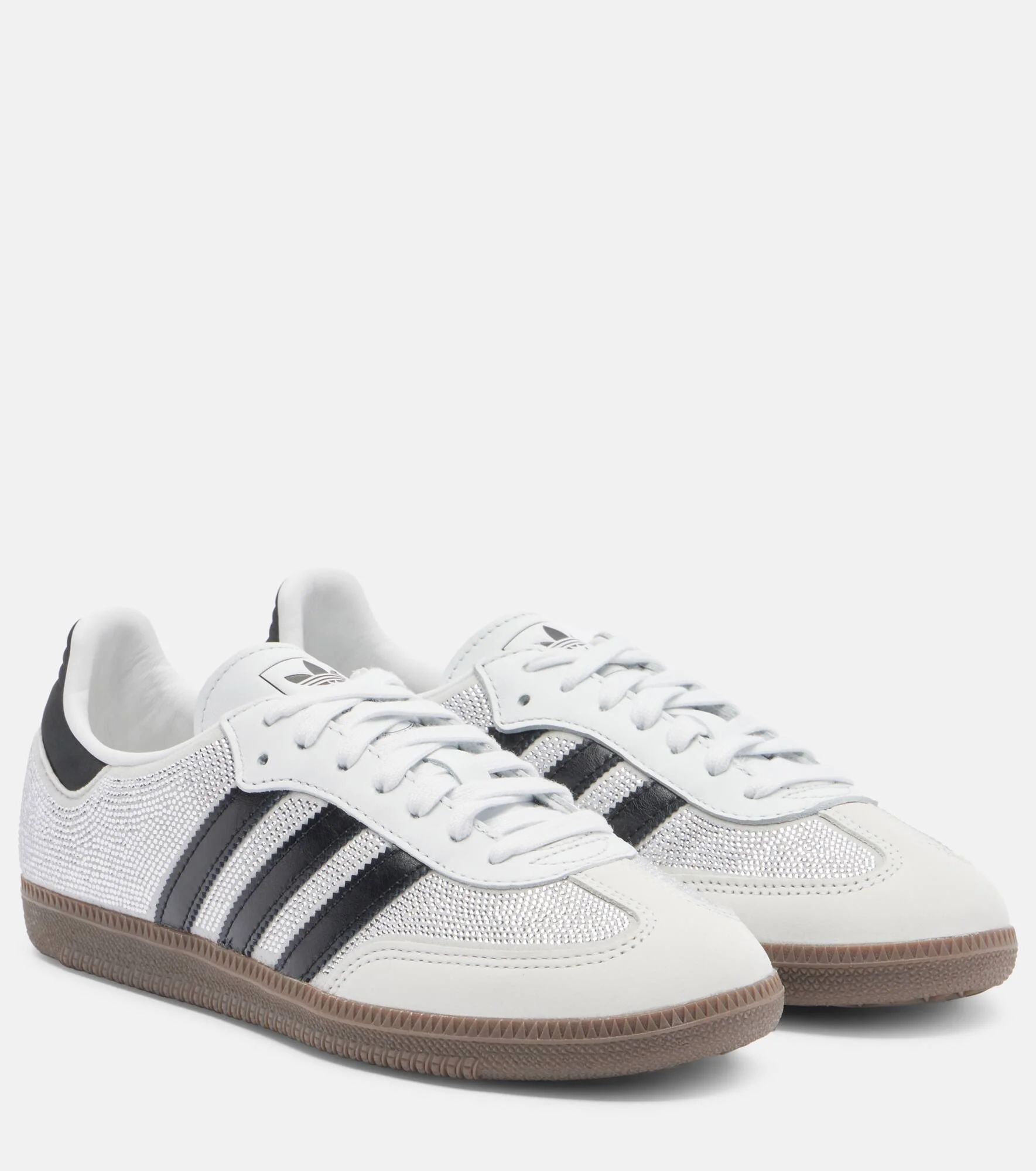 A glamorous iteration of a classic style, these Samba OG leather sneakers from Adidas boast side panels covered in shimmering crystals. This pair features sleek lines and rests atop rubber soles. Product Details - Upper: leather, synthetic material - Lining: synthetic material - Sole: fabric insole, rubber sole - Color: silver - Toe shape: round toe - Made in Vietnam - Includes: shoe box - Designer color name: Crystal White/Core White/Silver - Item number: P01132016 Size & Fit - True to size - UK sizes