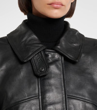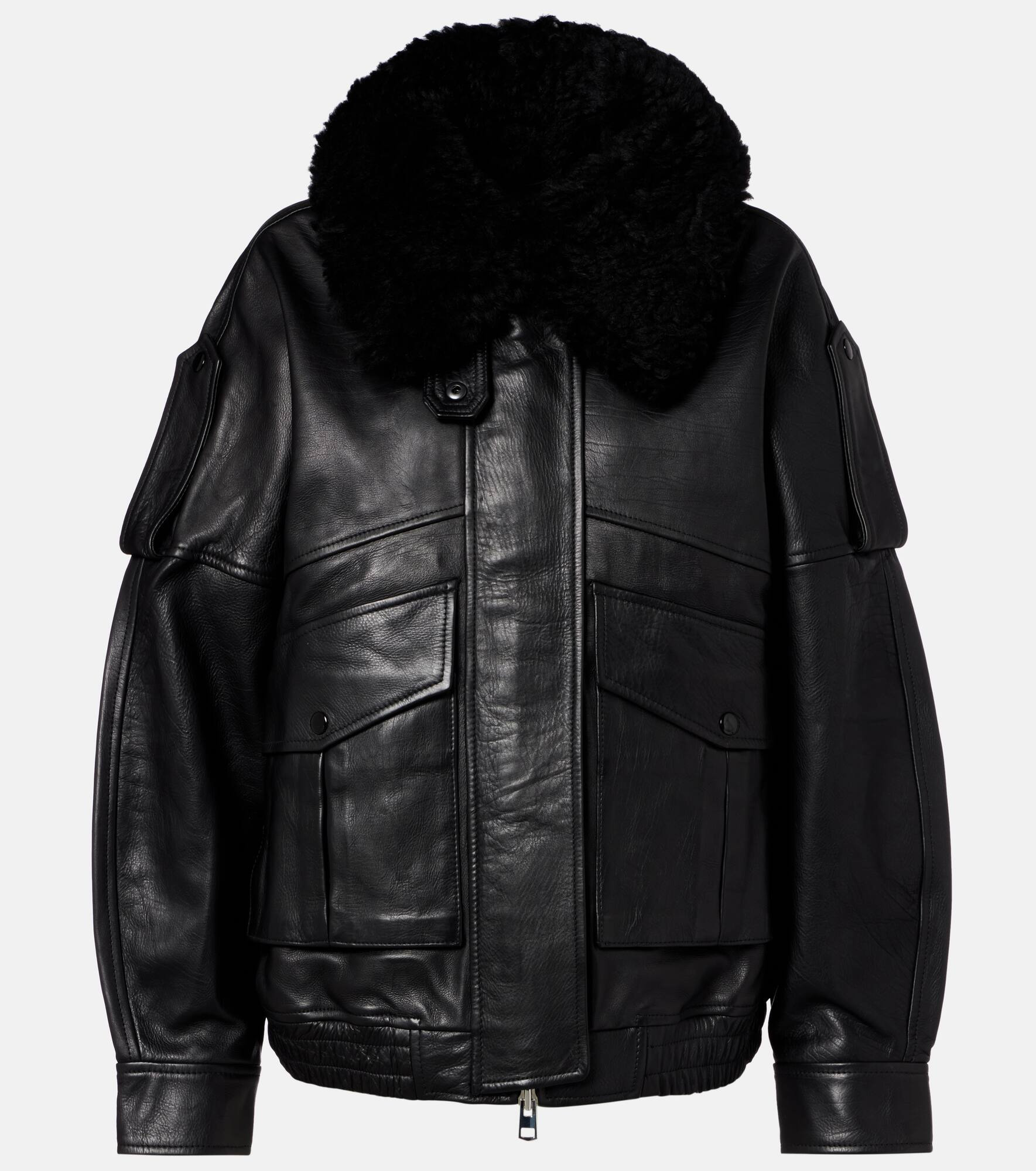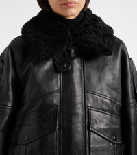 Bold, daring, yet casual at once, the Avril jacket by Agolde will not go unnoticed. Crafted from soft leather and featuring an oversized silhouette, this piece features a shearling collar and functional, refined details. Product Details - Material: 100% calf leather - Care instructions: specialist clean - Made in India - Designer color name: Black - Item color: black - Lining: 100% polyester - Trim: 100% shearling - Contains non-textile parts of animal origin - Detachable collar - Closure: two-way zipped front with snap-button fastenings - Pockets: cargo pockets - Cuff: buttoned - Hem: elasticated - Item number: P01111888 Size & Fit - True to size - Dropped shoulders - Elasticated hem - Oversized - Non-stretchy fabric - Falls below the hip - The model seen in the picture is 178cm-5'10" and wearing a size XS