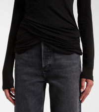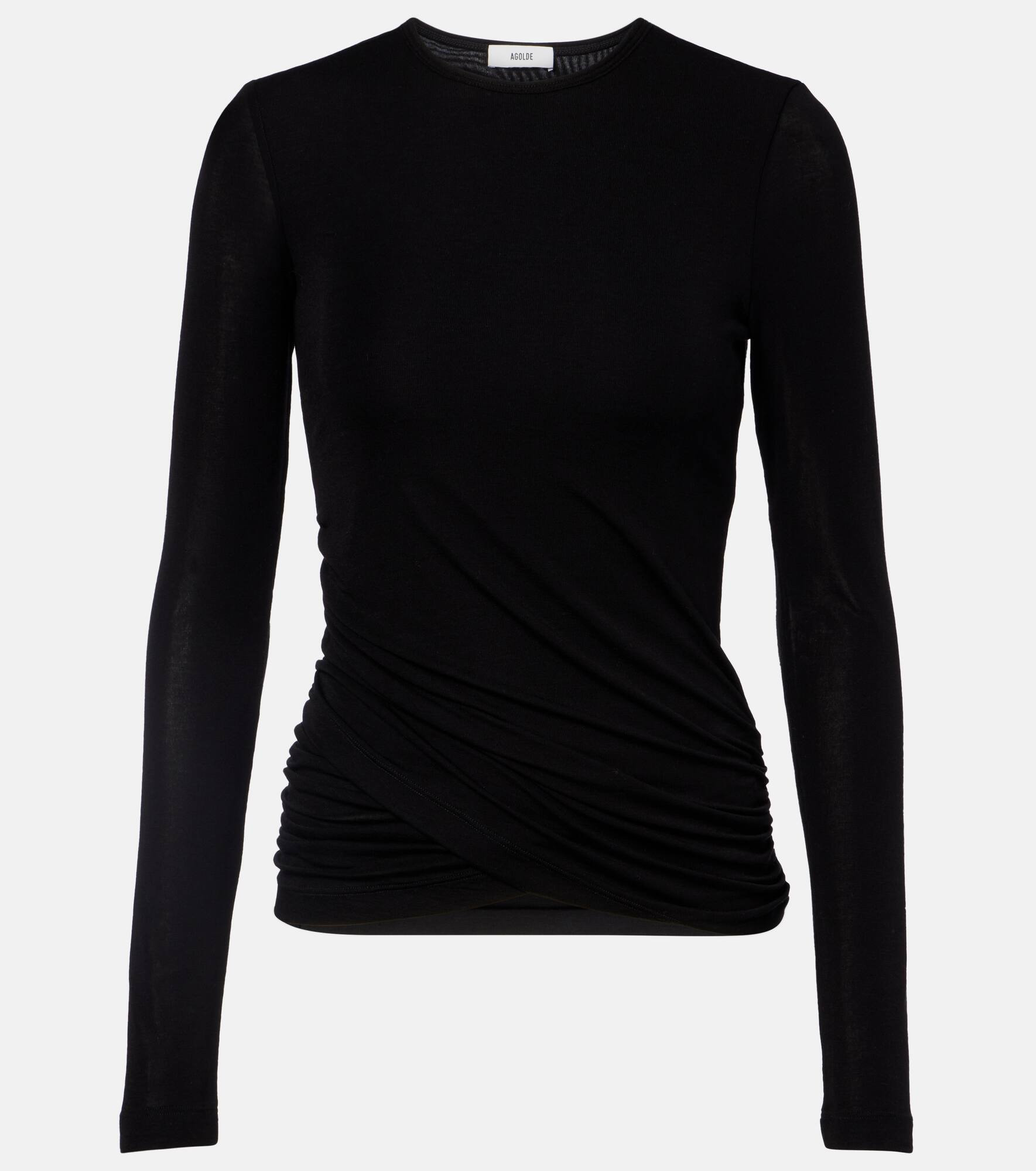 Every Agolde design is crafted from premium fabric and fit-tested. The Eve T-shirt is designed with a close-fitting silhouette, long sleeves, and a crossed front that creates subtle draping. Product Details - Material: 94% lyocell, 6% elastane - Care instructions: hand wash cold - Made in the USA - Designer color name: Black - Item color: black - Collar: crewneck - Sleeves: long-sleeved - Item number: P01111903 Size & Fit - True to size - Fitted - Stretchy fabric - Falls to the hip - The model seen in the picture is 178cm-5'10" and wearing a size XS