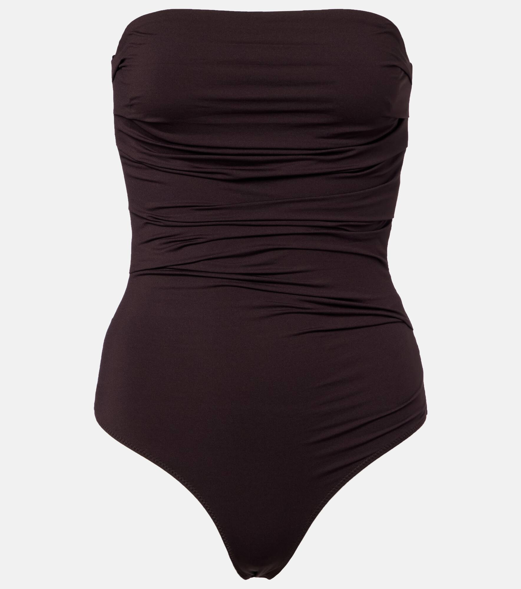 The Gwyneth bodysuit from Agolde is made from the brand's signature second-skin fabric to a sleek streamlined silhouette. The strapless design features ruched detailing and a low-cut back. Product Details - Material: 74% polyamide, 26% elastane - Care instructions: machine wash cold - Made in Portugal - Designer color name: Chocolate Dk Brown - Item color: brown - Closure: snap-buttoned fastenings - Item number: P01111917 Size & Fit - True to size - Strapless - Fitted - Stretchy fabric - Medium-cut leg - The model seen in the picture is 178cm-5'10" and wearing a size XS