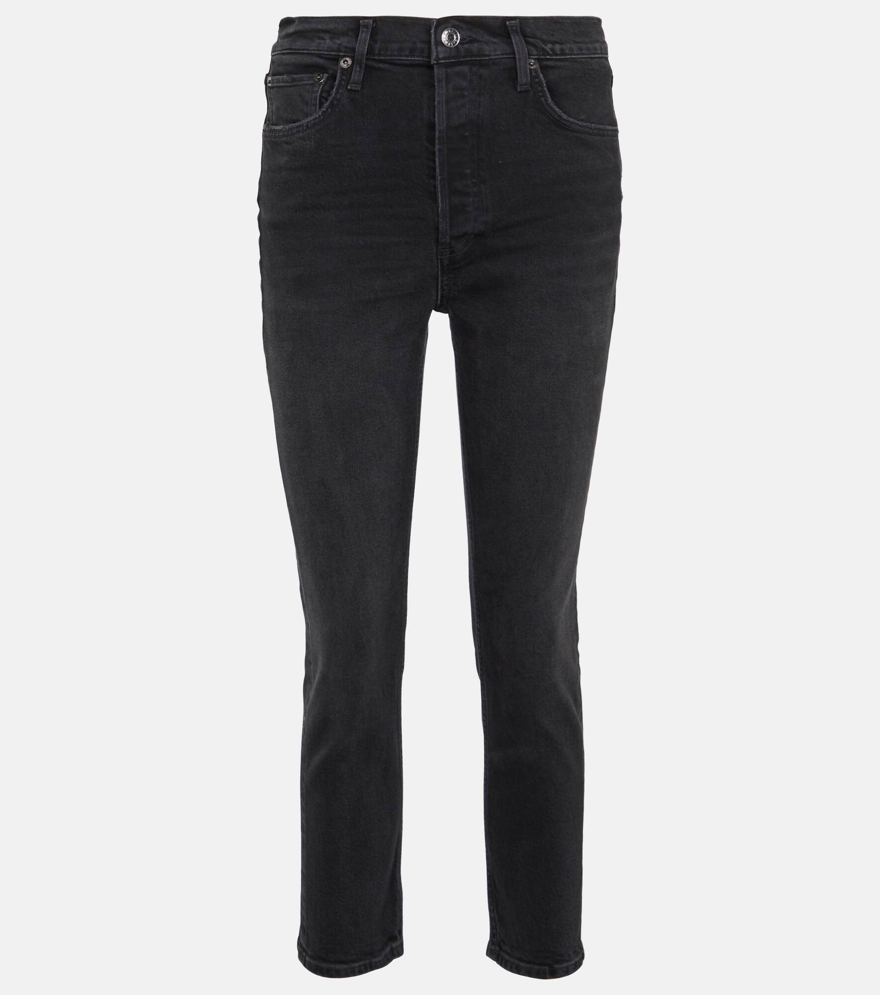 Build your denim collection around Agolde's timeless black Riley jeans. The high-rise pair has slim legs – enhanced with cropped cuffs. Product Details - Material: 96% organic cotton, 1% elastane, 3% polyester - Care instructions: machine wash cold - Made in Turkey - Designer color name: Panoramic - Pockets: five pockets - Belt loops - Closure: zipper fly, button fastening - Item number: P00597763 Size & Fit - True to size - Non-stretchy fabric - Slim-leg - High-rise - Inseam length approx: 64cm-25" - The model seen in the picture is 178cm-5'10" and wearing a size 27