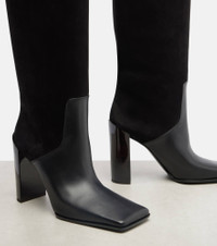 These knee-high boots from Alaia are crafted with smooth leather and suede panels. Defined by a square toe silhouette and distinctive arch, the pair rests on sturdy 90mm block heels. Product Details - Upper: leather - Lining: leather - Sole: leather insole and sole - Color: black - Toe shape: square toe - Made in Italy - Includes: shoe box, dust bag - Designer color name: Noir - Item color: black - Item number: P01130206 Size & Fit - True to size - Half sizes please take the next size down - European sizes - 9cm-3.5" heel - 39cm-15.5" shaft height (size EU 38) - 40cm-15.5" shaft width (size EU 38) - shaft width measured on largest part of boot