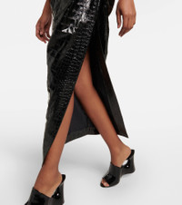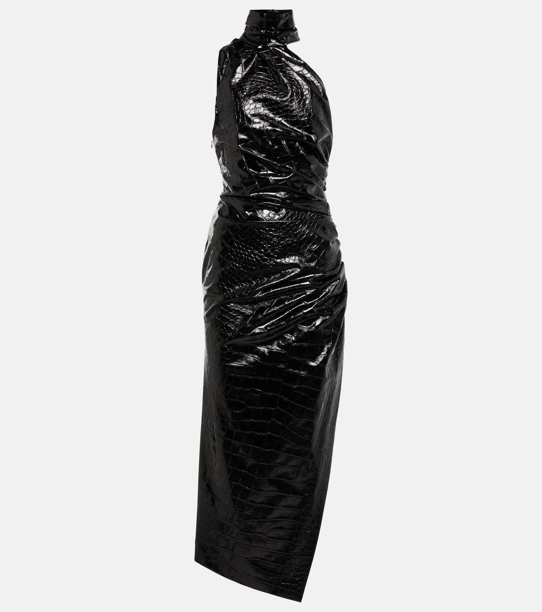 Make a bold statement at your next cocktail party in this asymmetric midi dress from Alaïa. It's made from croc-effect faux leather with a draped fit and a high neck. Product Details - Material: 96% viscose, 4% elastane - Care instructions: dry clean - Made in France - Designer color name: Noir Alaia - Closure: hook-fastening back - Item number: P00747469 Size & Fit - True to size - Low back - Cinched waist - Mid-weight material - slit length 60cm-23.5" - The model seen in the picture is 178cm-5'10" and wearing a size FR 36