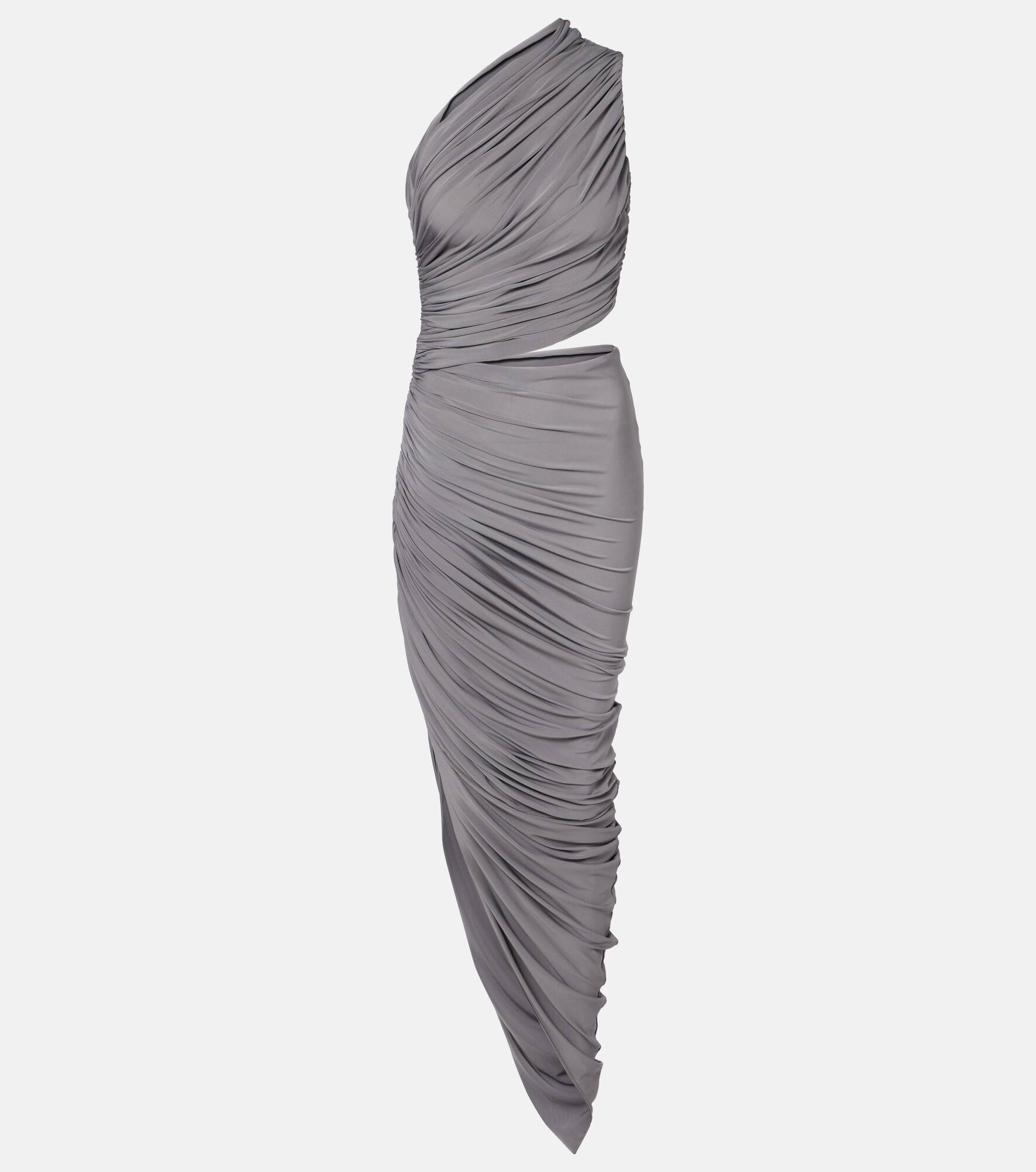 This Alaia asymmetric cutout maxi dress in soft jersey offers a graceful silhouette with ruching on one shoulder. Featuring a side cut-out and a body-hugging fit, this design effortlessly blends modern allure with Italian craftsmanship. Product Details - Material: 96% viscose, 4% elastane - Care instructions: specialist clean - Made in Italy - Designer color name: Gris Persan - Item color: gray - Hem: uneven - Item number: P01047397 Size & Fit - True to size - Sizing adapted to taller women - Fitted - Stretchy fabric - The model seen in the picture is 178cm-5'10" and wearing a size FR 36