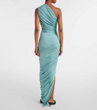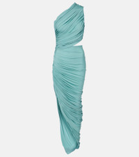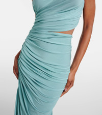 This Alaia asymmetric cut-out maxi dress in soft jersey offers a graceful silhouette with ruching on one shoulder. Featuring a side cutout and a body-hugging fit, this design effortlessly blends modern allure with Italian craftsmanship. Product Details - Material: 96% viscose, 4% elastane - Care instructions: specialist clean - Made in Italy - Designer color name: Ocean Blue - Item color: blue - Hem: uneven - Item number: P01047395 Size & Fit - True to size - Fitted - Stretchy fabric - The model seen in the picture is 178cm-5'10" and wearing a size FR 34