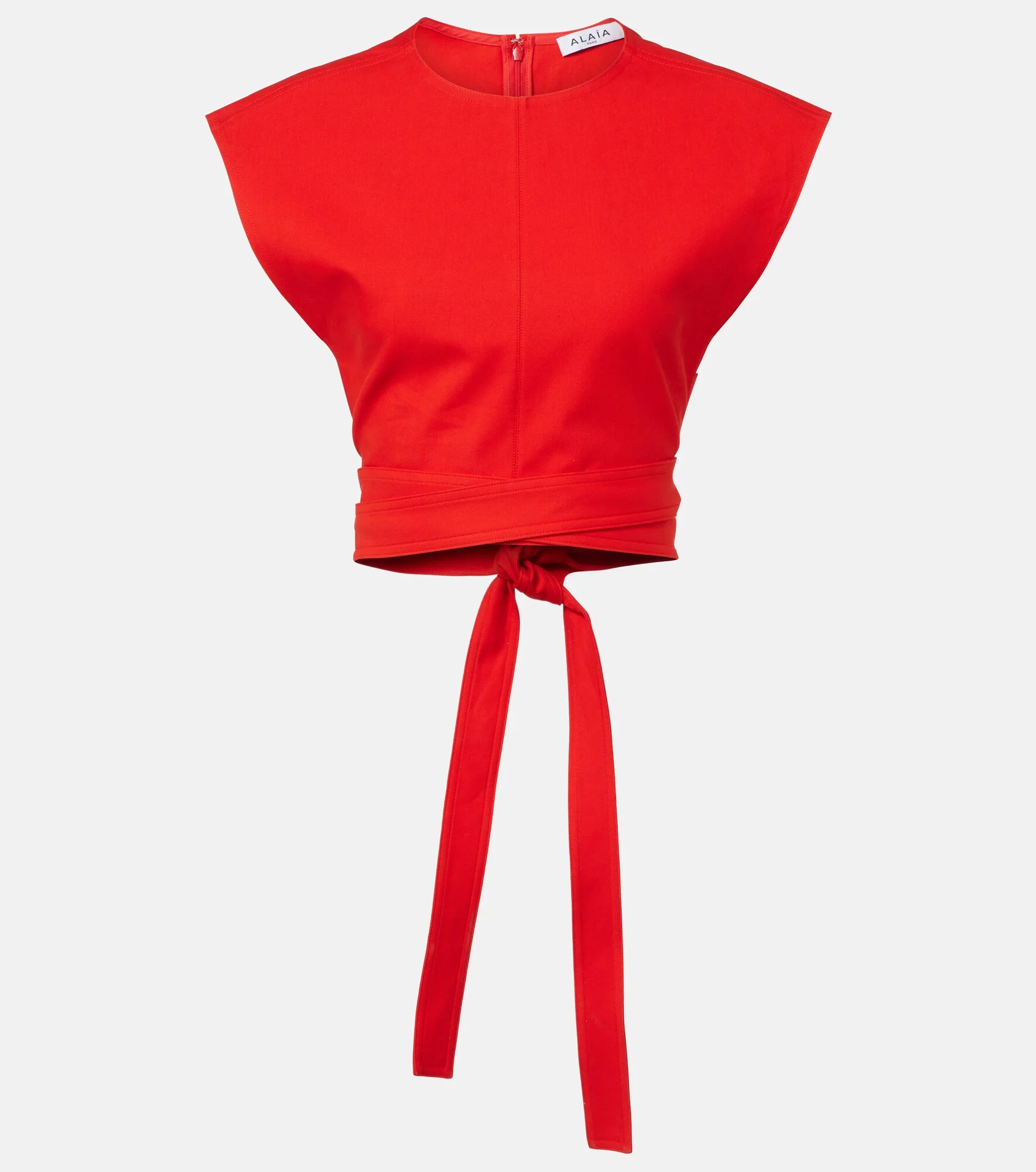 Upholding the legacy of Azzedine Alaia, the maison’s collections achieve an artful balance between sculptural and wearable. This crop top is made in Italy from cotton gabardine with an attached belt that ties at the back. Product Details - Material: 100% cotton - Care instructions: dry clean - Made in Italy - Color: red - Designer color name: Orange Sanguine - Self-tie belt - Closure: concealed zipped back, hook fastening - Item number: P01166090 Size & Fit - True to size - Cinched waist - Adjustable hem - Non-stretchy fabric - Cropped - The model seen in the picture is 178cm-5'10" and wearing a size FR 34