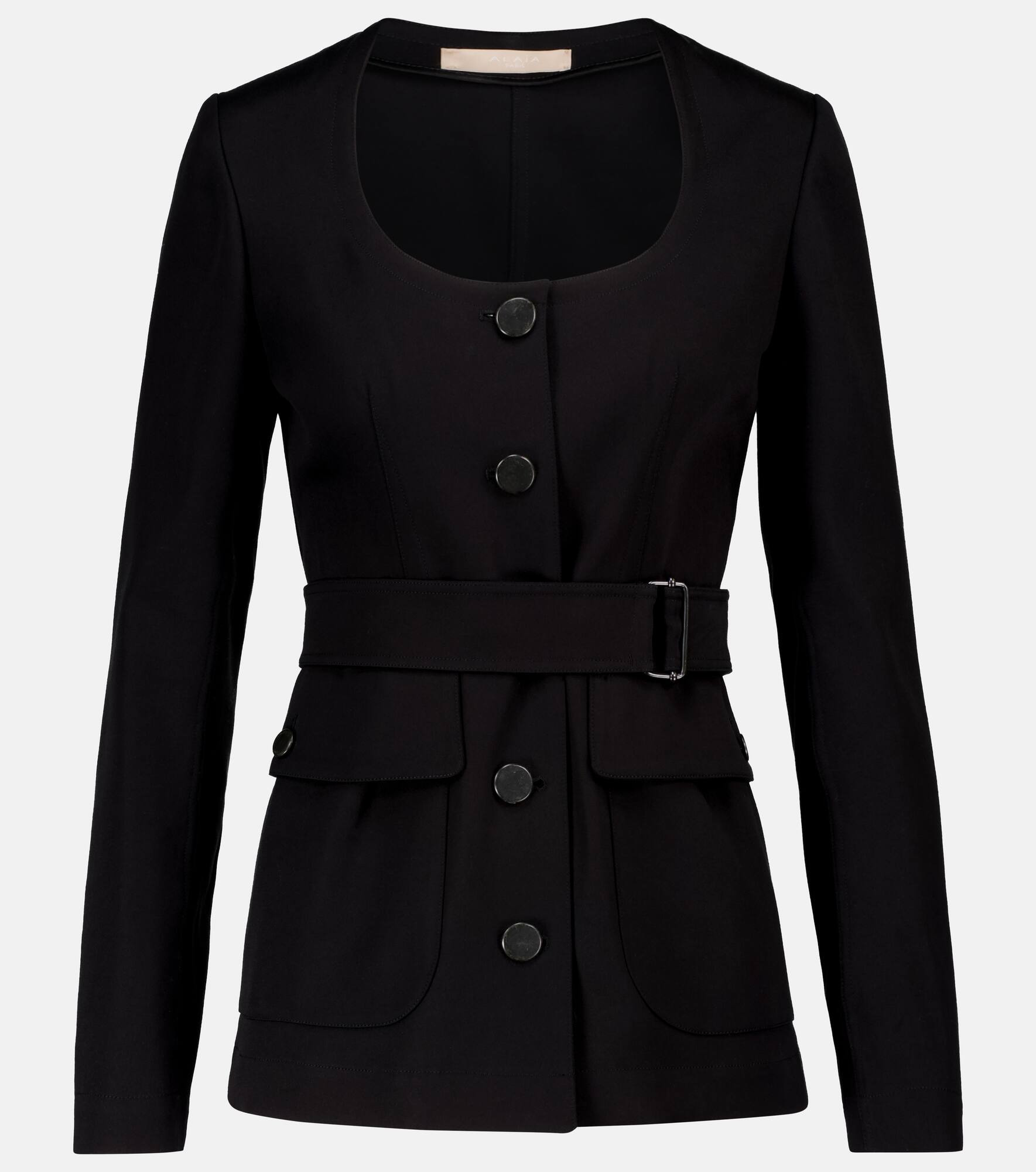 This jacket from Alaïa taps into a key suiting silhouette this season – the sharply tailored, square-neck blazer. Made in France from cotton gabardine that will hold its shape, it has a slim fit with padded shoulders and a self belt at the waist. It's begging to be worn with a chunky chain necklace or turtleneck. Product Details - Pockets: buttoned pockets - Material: 100% cotton - Detachable belt, Belt loops - Made in France - Designer color name: Noir - Lining: partially lined, 100% cupro - Closure: buttoned front - Care instructions: dry clean - Shoulder pads - Item number: P00527788 Size & Fit - True to size - Loose fit, comes with belt - Mid-weight material - Falls below the hip - The model seen in the picture is 178cm-5'10" and wearing a size FR 36
