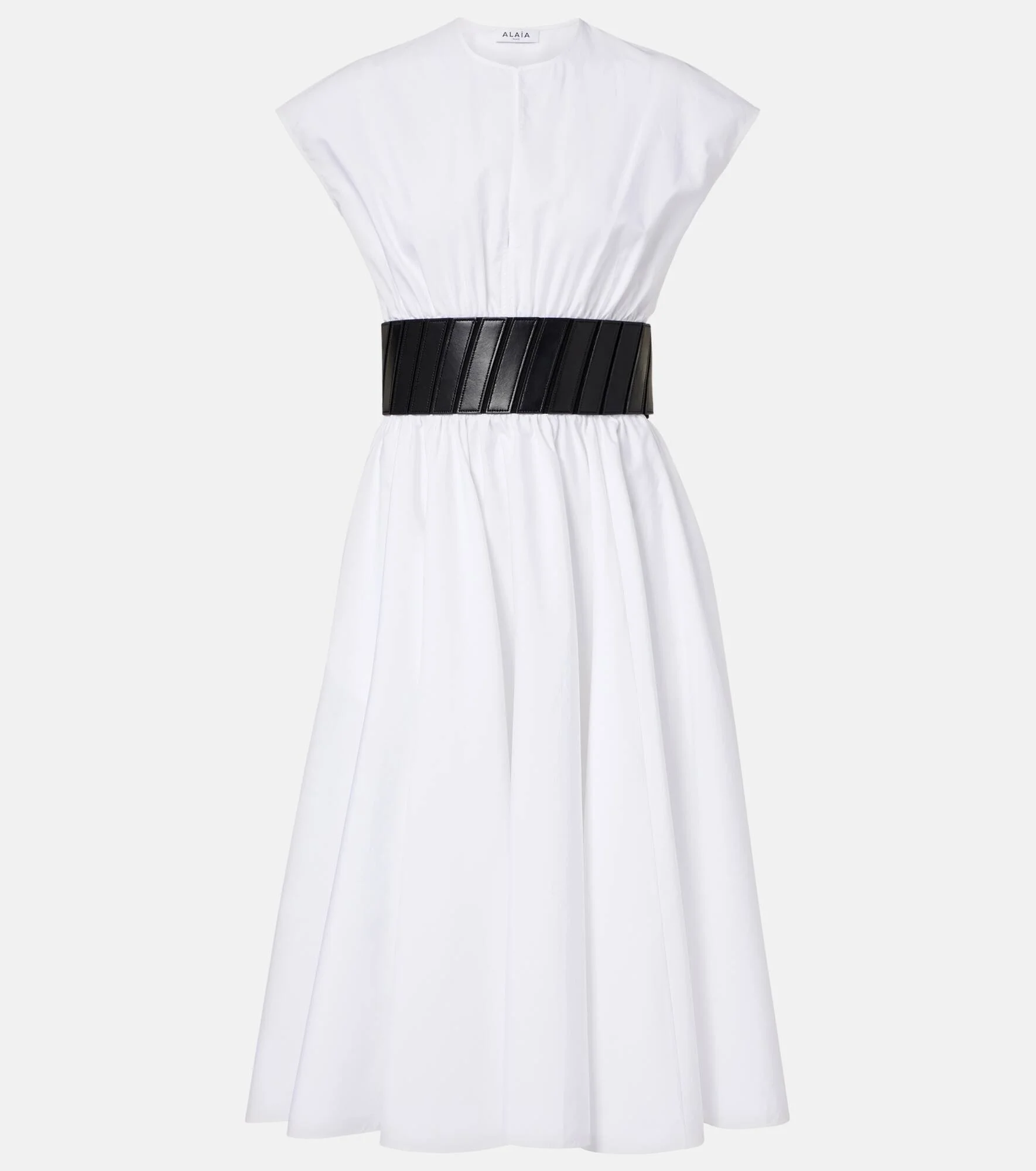 Upholding the legacy of Azzedine Alaia, the maison’s collections achieve an artful balance between sculptural and wearable. This midi dress is crafted from cotton and boasts side slit pockets and an attached leather belt at the waist. Product Details - Material: 100% cotton - Care instructions: specialist clean - Made in Italy - Color: white - Designer color name: Blanc - Details: 100% lamb leather - Contains non-textile parts of animal origin - Closure: zipped side, VELCRO® fastening - Pockets: side slit pockets - Attached belt - Item number: P01118791 Size & Fit - True to size - Cinched waist - Non-stretchy fabric - The model seen in the picture is 178cm-5'10" and wearing a size FR 34