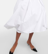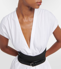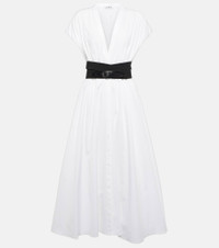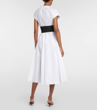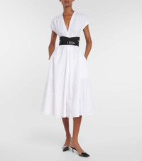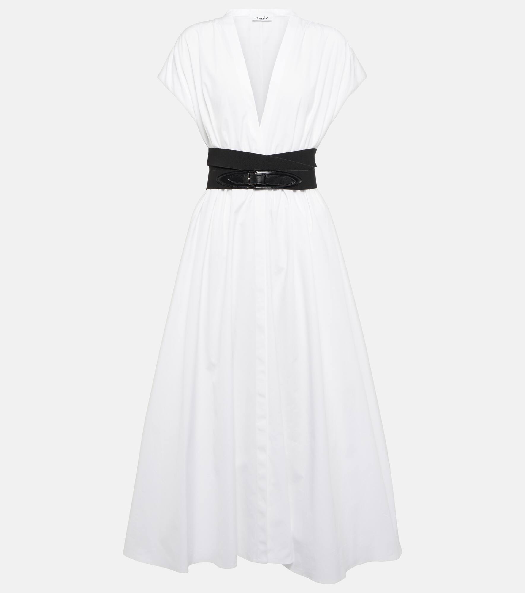 In signature Alaïa style, this midi dress is cinched at the waist with an integrated leather and elasticated crossover belt. Made in Italy from structured cotton poplin, it’s shaped with cap sleeves and a flared, pleated skirt. Product Details - Made in Italy - Material: 100% cotton - Trim: leather - Designer color name: Blanc - Pockets: slit pockets - Contains non-textile parts of animal origin - Care instructions: specialist clean - Item number: P00846578 Size & Fit - True to size - Loose fit, comes with belt - Mid-weight material - The model seen in the picture is 178cm-5'10" and wearing a size FR 36