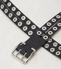 Inspired by the classic biker jacket, this belt from Alaia rounds off any ensemble with bold sophistication. This style is crafted from supple black leather and features a double belt construction, allover eyelets, and a double tongue buckle closure. Product Details - Material: calf leather - Lining: calf leather - Made in Italy - Designer color name: Noir - Item color: black - Hardware color: silver - Item number: P01058167 Size & Fit - Width 3cm-1" - Buckle width 4cm-1.5"