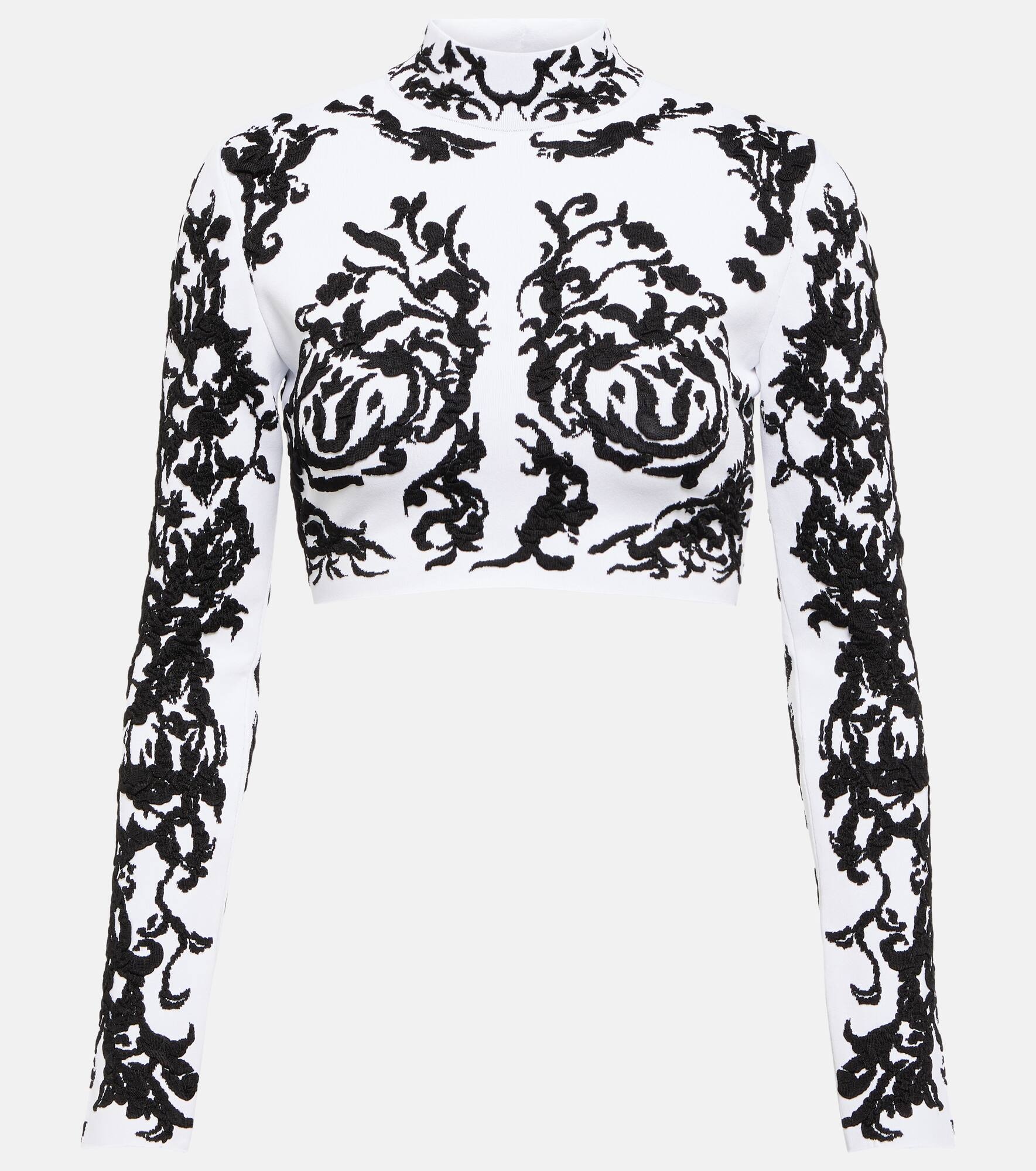 Made in Italy, the Calligraphy crop top features an ornate jacquard pattern with a slight puckering effect. The long-sleeved design has a sophisticated high neckline. Product Details - Material II: 18% polyamide, 64% viscose, 5% elastane, 13% polyester - Designer color name: Blanc/Noir - Material III: 100% viscose - Care instructions: dry clean - Made in Italy - Material: 21% polyamide, 4% elastane, 61% viscose, 12% polyester, 2% polyurethane - Item number: P00746575 Size & Fit - True to size - Fitted - Mid-weight material - Cropped - The model seen in the picture is 178cm-5'10" and wearing a size FR 36