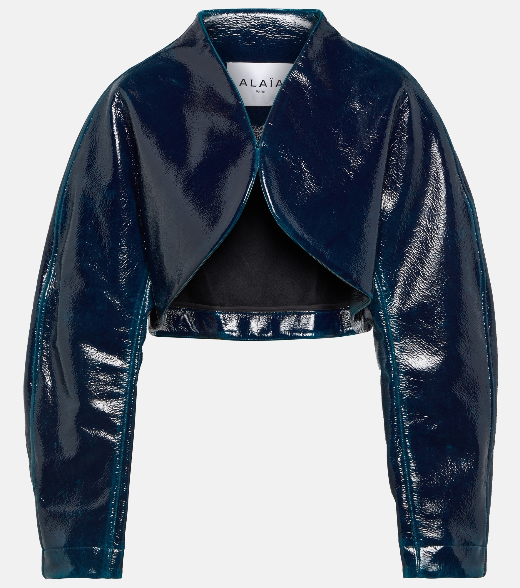 This sculptural jacket spotlights Alaïa's sartorial focus on textile engineering. Appearing with a glossy coated wool composition, this blue cotton-lined cropped jacket has a bolero-inspired silhouette with a curved open-face construction and angled long sleeves. Product Details - Material: 70% wool, 16% polyamide, 14% polyurethane - Care instructions: dry clean - Made in Italy - Lining: 100% cotton - Details: 100% cotton - Closure: hook-fastening front - Item number: P00846565 Size & Fit - True to size - Oversized - Mid-weight material - Cropped - The model seen in the picture is 178cm-5'10" and wearing a size FR 36