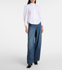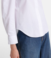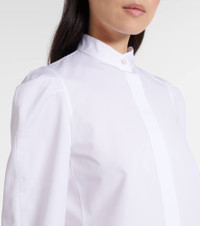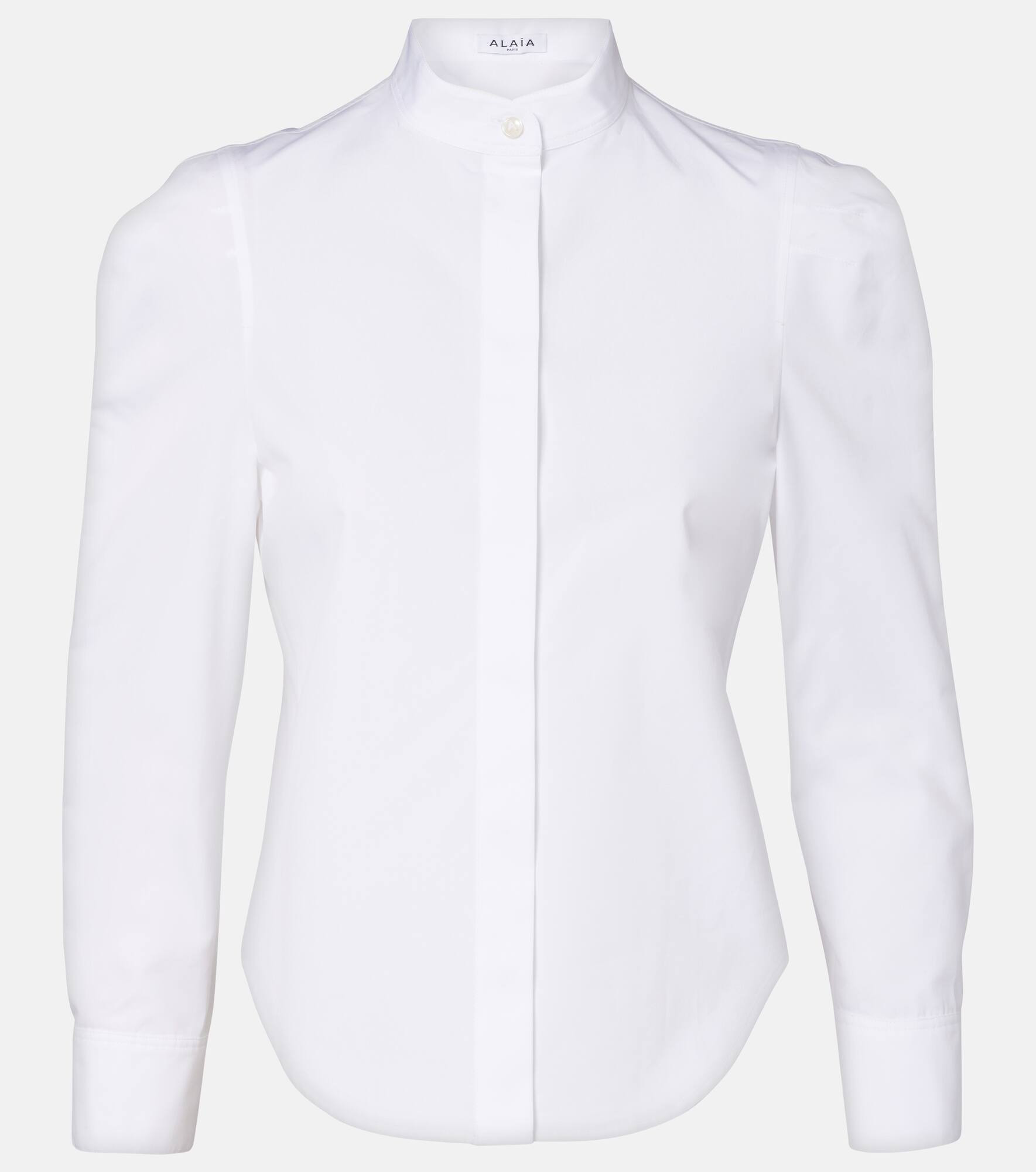 Honoring Azzedine Alaia’s legacy, the maison’s sculptural yet wearable collections hold an artful balance that only the most skilled designers can achieve. This shirt is crafted in Italy from cotton poplin and features an elegant buttoned placket. Product Details - Material: 100% cotton - Care instructions: dry clean - Made in Italy - Designer color name: Blanc - Item color: white - Collar: band - Closure: concealed button placket - Cuff: two buttons - Hem: rounded - Item number: P01085216 Size & Fit - True to size - Slightly short sleeves - Cinched waist - Non-stretchy fabric - Falls to the hip - The model seen in the picture is 178cm-5'10" and wearing a size FR 34