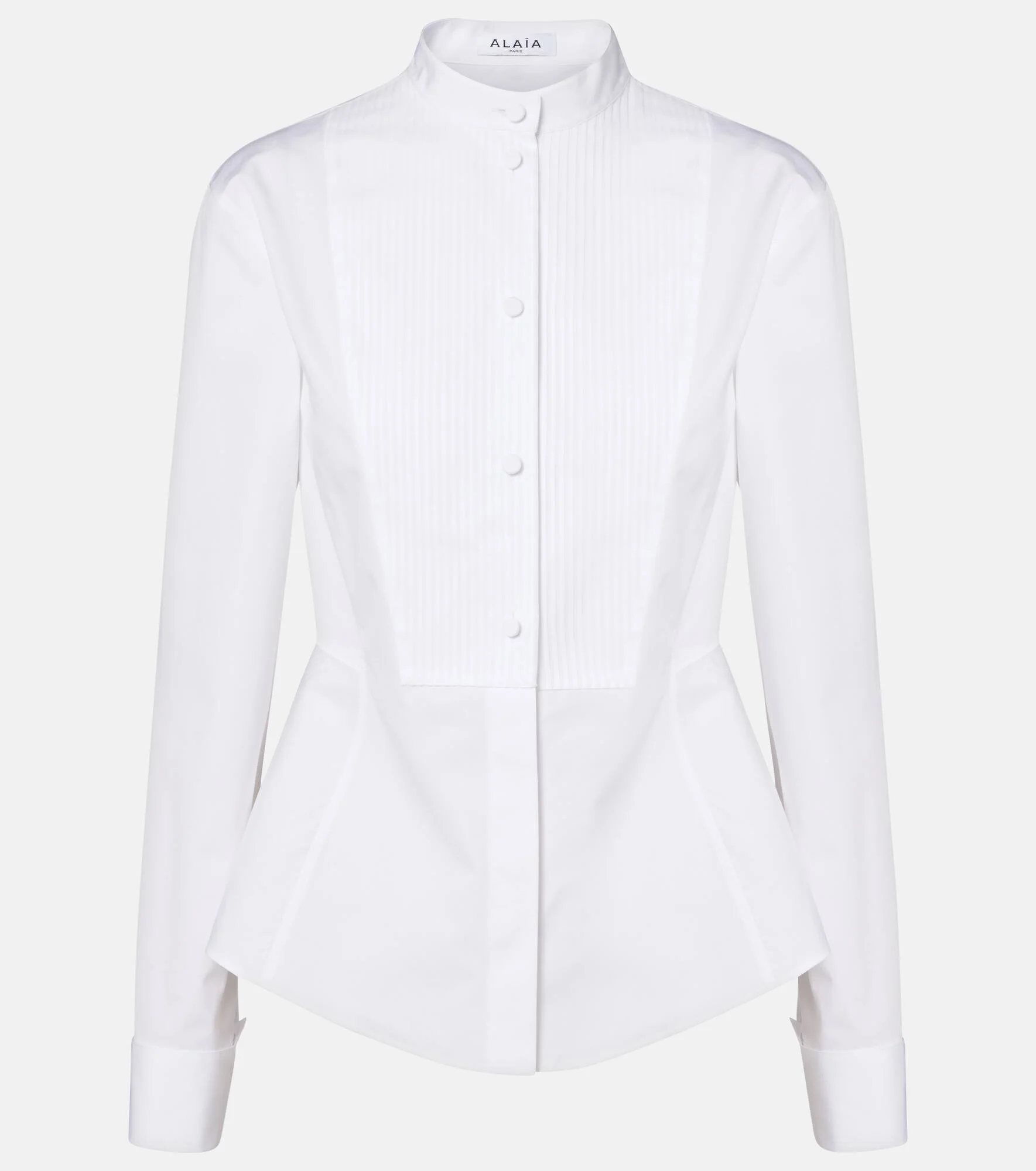 Upholding the legacy of Azzedine Alaia, the maison’s collections achieve an artful balance between sculptural and wearable. This tuxedo-inspired shirt is made from cotton and features a pleated panel for added sophistication. Product Details - Material: 100% cotton - Care instructions: dry clean - Made in Italy - Designer color name: Blanc - Item color: white - Contains non-textile parts of animal origin - Collar: band - Cuff: French round - Closure: buttoned front - Item number: P01118810 Size & Fit - True to size - Cinched waist - Non-stretchy fabric - Falls to the hip - Height of model is 180cm-71" and wears a size FR 34