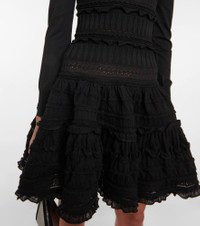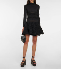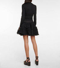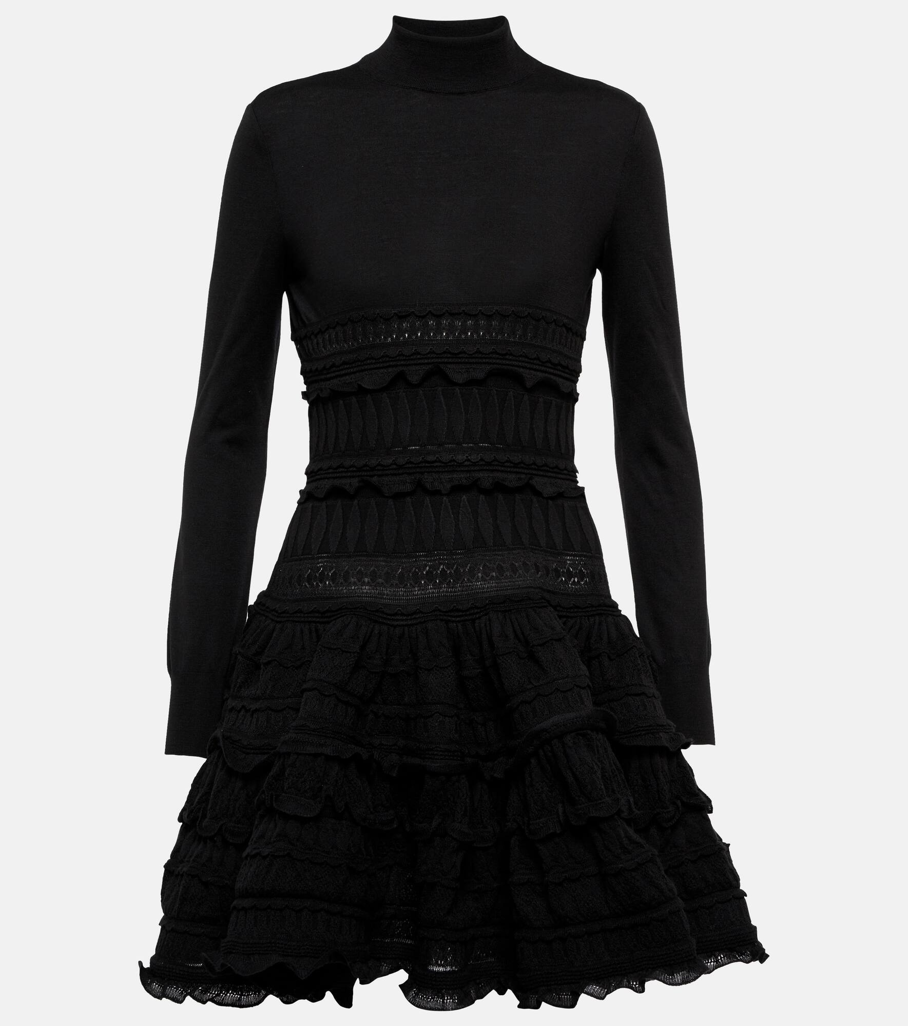 The Crinoline minidress showcases Alaïa’s artful affinity for sculptural design. Framing the silhouette with a scooped neckline and a voluminous skirt, this piece is made from pure wool in a ribbed-knit construction with contrasting pointelle panels and a scalloped trim. Product Details - Material II: 6% polyamide, 92% virgin wool, 2% elastane - Made in Italy - Material: 100% virgin wool - Designer color name: Noir Alaia - Material III: 100% virgin wool - Material IV: 100% polyester - Care instructions: dry clean - Item number: P00700683 Size & Fit - True to size - Fitted bodice, loose skirt - Mid-weight material - Stretchy fabric - The model seen in the picture is 178cm-5'10" and wearing a size FR 36
