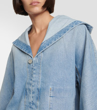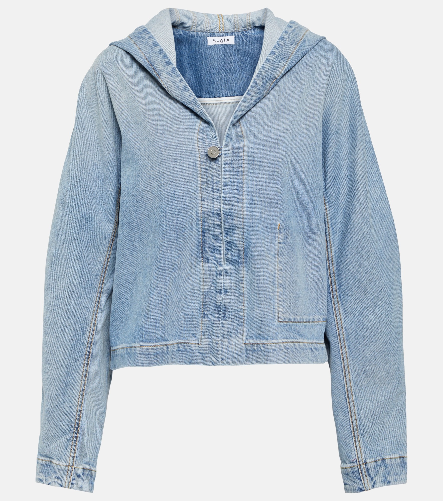 This jacket from Alaia is the perfect compromise between casualwear and outerwear. The cropped design is made from cotton denim, featuring a V-neckline with a hood and a one-buttoned front with a patch pocket and lightly puffed sleeves. Product Details - Material: 99% cotton, 1% polyurethane - Care instructions: dry clean - Made in Italy - Designer color name: Bleu Clair - Details: 35% cotton, 65% polyester - Pockets: internal pockets - Closure: buttoned front - Hood - Item number: P00846513 Size & Fit - True to size - Dropped shoulders - Oversized - Mid-weight material - Slightly cropped - The model seen in the picture is 178cm-5'10" and wearing a size FR 36