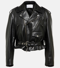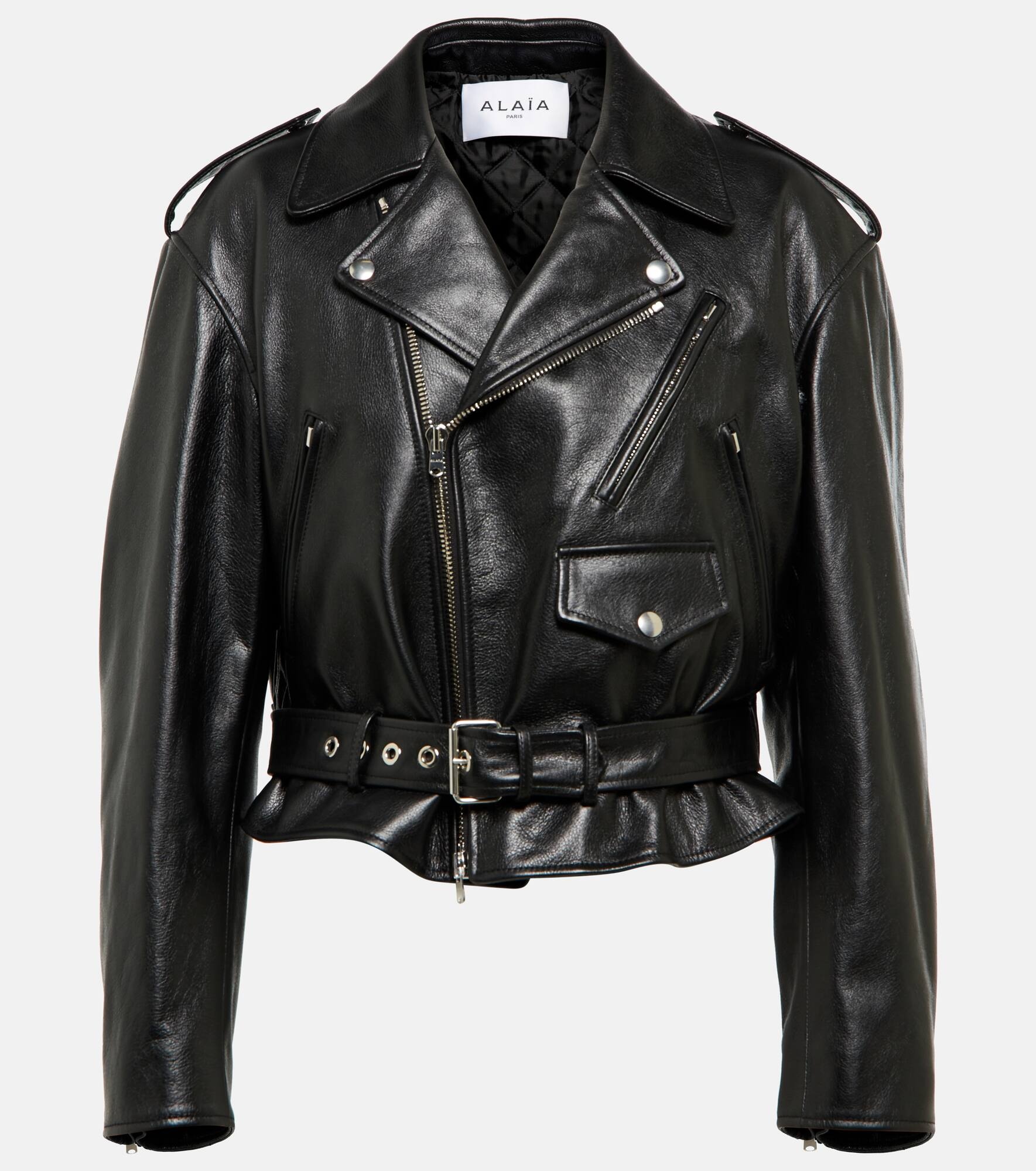 This cropped biker jacket from Alaïa is both, edgy and delicate. The piece is made from calfskin leather, ruffles out below the belt, and is trimmed with silver hardware. Product Details - Epaulettes - Closure: zipped front - Zipped cuffs - Attached belt - Material: 100% calf leather - Designer color name: Noir Alaia - Made in Italy - Care instructions: specialist clean - Pockets: buttoned pocket, zipped pockets - Lining: fully lined, 100% cupro - Item number: P00700945 Size & Fit - True to size - Oversized shoulders - Dropped shoulders - Cinched waist - Heavy material - Stiff material - Cropped - The model seen in the picture is 178cm-5'10" and wearing a size FR 36