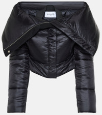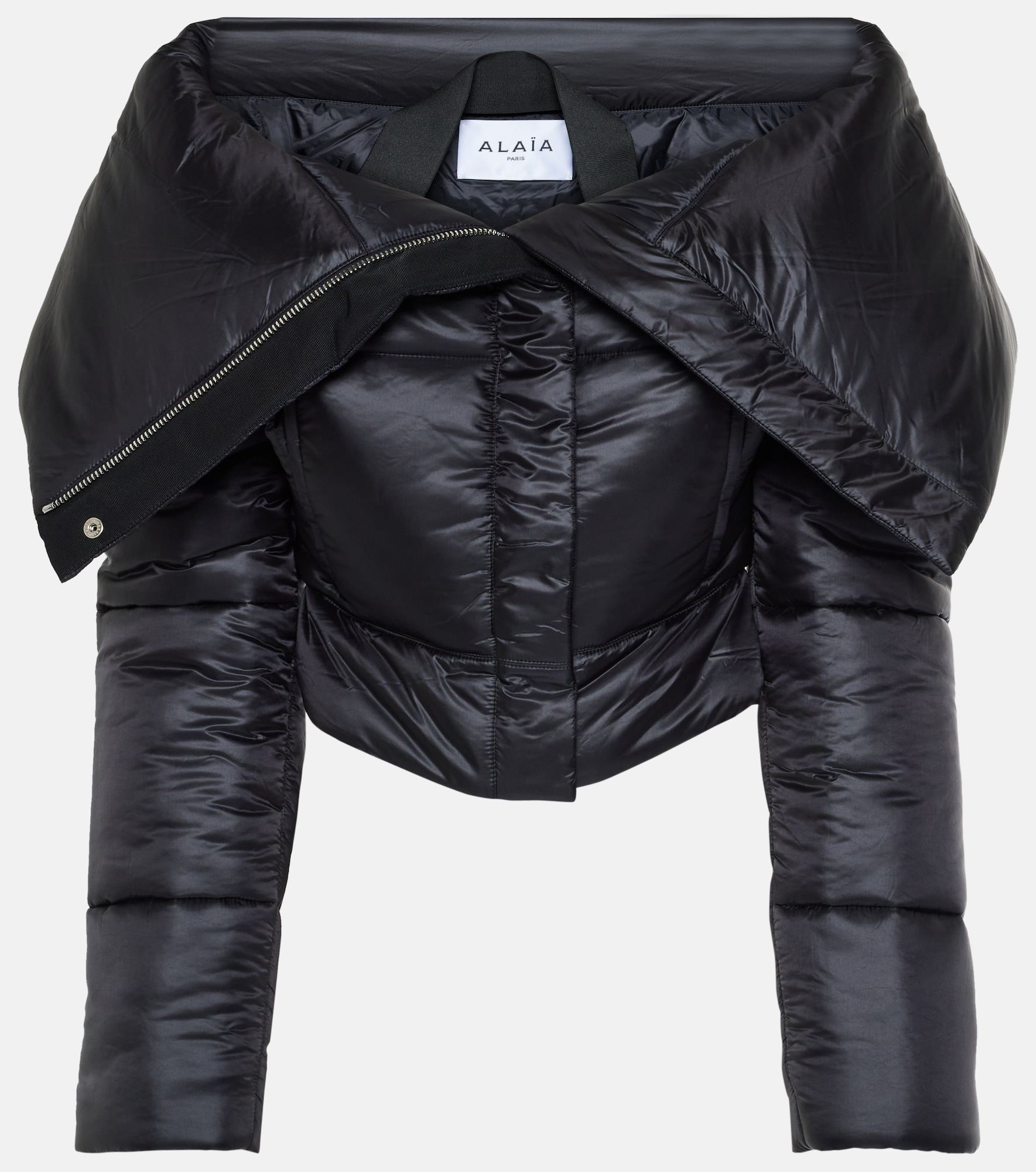 This cropped Alaïa puffer jacket has a maxi collar that can either be worn up or down off-shoulder for a unique look. It is Equipped with a front zip opening and a zipped side. Product Details - Material: 100% polyamide - Care instructions: specialist clean - Made in Italy - Designer color name: Noir Alaia - Filling: 100% polyester - Closure: zipper, snap-button fastenings - Pockets: zipped pockets - Item number: P00846534 Size & Fit - True to size - Cinched waist - Lightweight material - Cropped - The model seen in the picture is 178cm-5'10" and wearing a size FR 36