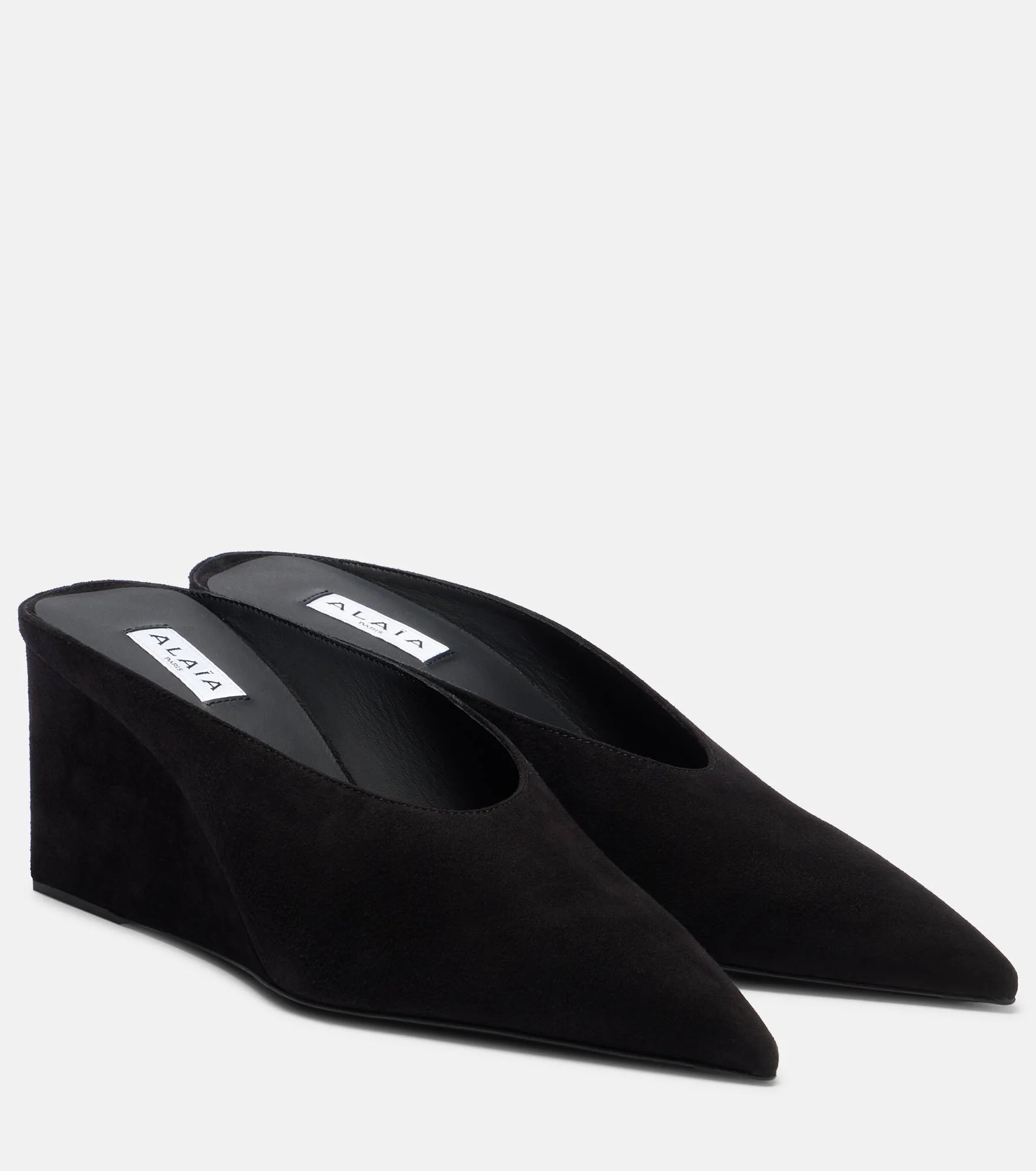 The Cube wedge mules by Alaia are crafted in Italy from supple suede. Featuring pointed toes and the maison's signature cube shape, this bold staple is set on 75mm heels. Product Details - Upper: goat leather (suede) - Lining: leather - Sole: leather insole, leather and rubber sole - Toe shape: pointed toe - Made in Italy - Includes: shoe box - Designer color name: Noir - Item color: black - Item number: P01130164 Size & Fit - True to size - Half sizes please take the next size up - European sizes - 7,5cm-3" wedge heel (size EU 38)