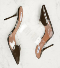 Aptly named for the heart-shaped appliques at the razor-sharp profiles, the Cœur pumps from Alaia are an elegant pair. Set on 90mm stiletto heels, they’re made from glossy patent leather and transparent PU paneling and straps. Product Details - Upper: leather, plastic - Lining: leather, plastic - Sole: leather insole, leather and rubber sole - Toe shape: pointed toe - Made in Italy - Includes: shoe box, dust bag - Designer color name: Kaki - Item color: brown - Contains non-textile parts of animal origin - Item number: P01045870 Size & Fit - Fits slightly small to size - we recommend trying a half size larger - European sizes - 10cm-4" heel (size EU 38)