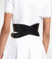 Upgrade your accessory edit with this leather belt from Alaïa. Made from smooth leather, this crossed design is accented by buckles on each side, creating a cut-out effect that accentuates the waistline. Product Details - Closure: buckle fastening - Color of fastening: antique gold - Material: calf leather - Comes with a box, Comes with dust bag - Made in Italy - Adjustable belt strap - Item number: P00752469 Size & Fit - Max. width 11,5cm-4.5"