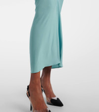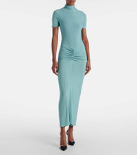 This Alaia maxi dress features ruching at the waist and a draped skirt that creates a fluid, elongating silhouette. A mockneck, short sleeves, and interior bodysuit underlayer complete this effortlessly glamorous design. Product Details - Material: 96% viscose, 4% elastane - Care instructions: specialist clean - Made in Italy - Designer color name: Bleu Ocean - Item color: blue - Collar: mockneck - Closure: zipped back, snap-buttoned fastenings - Partially lined - Item number: P01047394 Size & Fit - True to size - Fitted - Stretchy fabric - The model seen in the picture is 178cm-5'10" and wearing a size FR 36